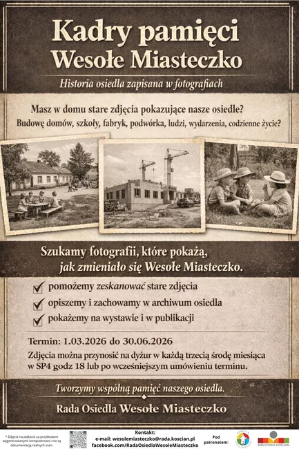 Rada Osiedla Wesołe Miasteczko w Kościanie rozpoczyna projekt społeczny pod nazwą „Kadry pamięci”. Celem inicjatywy jest stworzenie archiwum obrazującego historię osiedla na podstawie fotografii przechowywanych w prywatnych albumach mieszkańców.