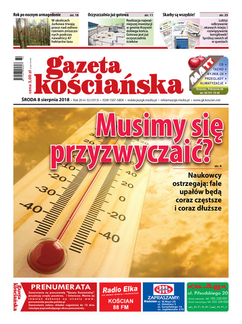 W numerze między innymi: o tym, że upały będę coraz częstsze i dłuższe, o powrocie kościańskich strażaków ze Szwecji, o odkrywaniu ciekawych miejsc i rozwiązywaniu łamigłówek, o odtwarzaniu lasu powalanego podczas ubiegłorocznej nawałnicy, raz jeszcze o kładce prowadzącej na perony kościańskiej stacji, o pierwszym filmie poświęconym kościańskiej przyrodzie, o zdjęciach powiatu sprzed dekady, o tym jak na ziemi kościańskiej „majstrowano” przy wyborach do sejmu, o rocznicy urodzin i śmierci Adama Tomaszewskiego, o festiwalu Surzyńskiego. Ponadto: ilustrowany przegląd wydarzeń tygodnia z wszystkich gmin powiatu kościańskiego, kronika policyjna, informator kulturalny i obszerny serwis sportowy. Gazeta w sprzedaży od 8 sierpnia.