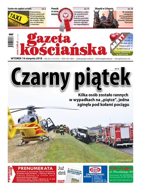 W numerze między innymi: o czarnym piątku na drogach powiatu, o bezpłatnych taksówkach dla seniorów, o dyskusji nad sensem wybudowania pomnika na czempińskim rynku, o gotujących strażakach i zawodach sikawek konnych, o szwedzkiej akcji kościańskich strażaków, o fotograficznej pasji leśniczego, o kapitanie Lecha Poznań z Kościana, o lokalnym rynku nieruchomości, o bulwarze i kościańskich mostkach. Ponadto: ilustrowany przegląd wydarzeń tygodnia z wszystkich gmin powiatu kościańskiego, kronika policyjna, informator kulturalny i obszerny serwis sportowy. Gazeta w sprzedaży od 14 sierpnia.