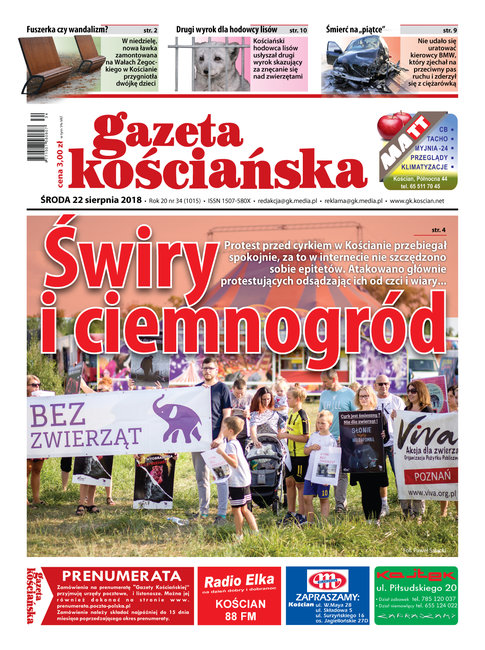 W numerze między innymi: o proteście przed cyrkiem i gorącej dyskusji w internecie, o zaoranej drodze w Poninie, o tym czy ławki na kościańskim bulwarze są bezpieczne, o kolejowym połączeniu ze Śremem, o wyroku dla hodowcy lisów, o małej księgarni, o umorzeniu postępowania dotyczące byłej dyrektor krzywińskiej biblioteki, program festiwalu baśni, o nagrodach za nieprzeciętność, o krwawych zajściach w przedwojennym Krzywiniu. Ponadto: ilustrowany przegląd wydarzeń tygodnia z wszystkich gmin powiatu kościańskiego, kronika policyjna, informator kulturalny i obszerny serwis sportowy. Gazeta w sprzedaży od 22 sierpnia.