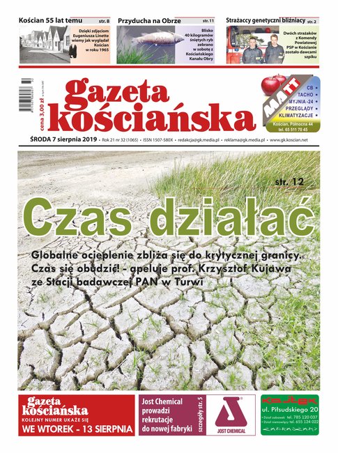 W numerze między innymi: o początku katastrofy ekologicznej i ostatniej szansie na podjęcie działań, o kolejnej przydusze na Obrze, o porzucanych w wakacje psach i kotach, o artystycznej podróży Darii z Kościana, o dawcach szpiku, o działalności kościańskiego oddziału Ligi Obrony Kraju, o społecznym archiwum fotograficznym oraz fotoreportaż z 1965 roku. Ponadto: ilustrowany przegląd wydarzeń tygodnia z wszystkich gmin powiatu kościańskiego, kronika policyjna, informator kulturalny i obszerny serwis sportowy. Gazeta w sprzedaży od 7 sierpnia