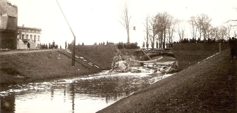 Kościan, luty 1945 r. Widok mostu wysadzonego 27 stycznia przez wycofujący się oddział Wehrmacht. Fot. ze zbiorów Jerzego Zielonki