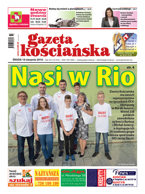 W numerze między innymi: o naszych na igrzyskach w Rio, o sporze miasta z Kauflandem i możliwym odszkodowaniu, o tym czy burmistrz Czempinia stosuje mobbing wobec dyrektorki szkoły w Głuchowie, o bardzo złej sytuacji finansowej Towarzystwa Opieki nad Zwierzętami, o kolejnych potyczkach z policją Patryka Tomaszewskiego, o wycofaniu się trzech gmin z finansowania półmaratonu, o sporze o strefę parkowania, o Feliksie Stammie i wolontariackiej przygodzie mistrza Polski juniorów. Ponadto: ilustrowany przegląd wydarzeń tygodnia z wszystkich gmin powiatu kościańskiego, kronika policyjna, informator kulturalny i obszerny serwis sportowy. Gazeta w sprzedaży od 10 sierpnia