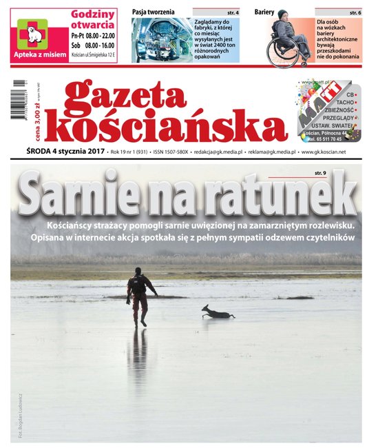 W numerze między innymi: o ratowaniu uwięzionej sarny, o trudach poruszania się po mieście osób w wózkach, o trenujących crossfit, o pasjonatach nordic walking, o pierwszych pływackich zawodach dla dzieci i młodzieży, o nowoczesnej fabryce w centrum miasta, o samorządowych kalendarzach, o ciekawym społecznym archiwum, o nielegalnych przyłączach do kanalizacji, o mażoretkach z Vervy, o budżetach miasta i powiatu, o ofercie kulturalnej w KOK. Ponadto: ilustrowany przegląd wydarzeń tygodnia z wszystkich gmin powiatu kościańskiego, kronika policyjna, informator kulturalny i obszerny serwis sportowy. Gazeta w sprzedaży od 4 stycznia