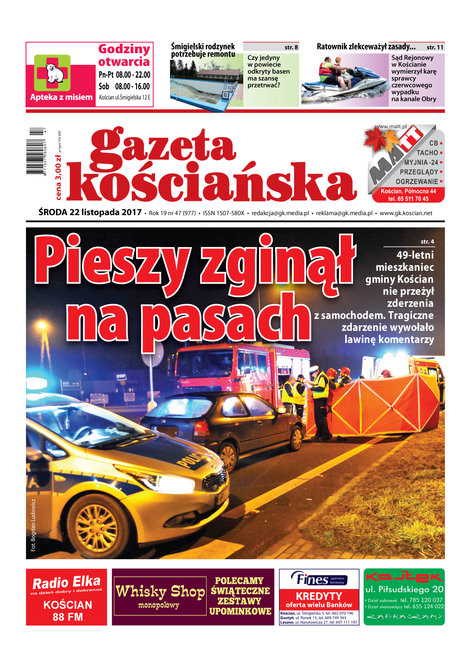 W numerze między innymi: o tragicznym wypadku na obwodnicy Kościana, o postępowaniu dyscyplinarny wobec katechetki, o budowie podziemnego przejścia w Czempiniu, o karze dla sprawcy wypadku na kanale Obry, o najszybszym człowieku w powiecie, raz jeszcze o kościańskich Łazienkach i bulwarze, o śmigielskim basenie, o terenach pod inwestycje, o stadionie dla lekkoatletów, o jubileuszu Jantara, o współdziałaniu na rzecz ochrony zwierząt. Ponadto: ilustrowany przegląd wydarzeń tygodnia z wszystkich gmin powiatu kościańskiego, kronika policyjna, informator kulturalny i obszerny serwis sportowy. Gazeta w sprzedaży od 22 listopada.