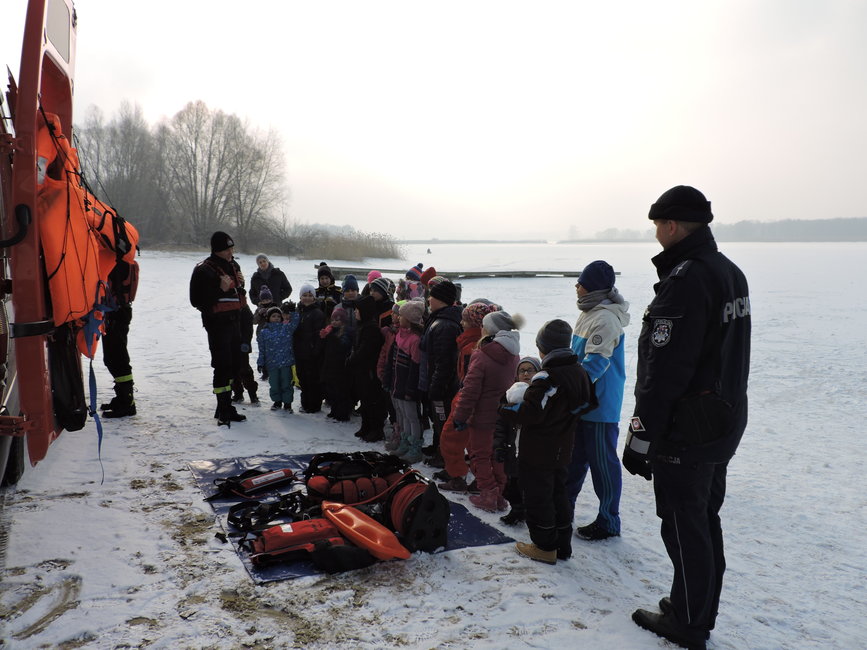 1 lutego na plaży w Dębcu Nowym wspólnie z Komendą Powiatową Policji zorganizowano zajęcia dotyczące bezpieczeństwa na zamarzniętych rzekach, kanałach stawach czy jeziorach. Tym razem zajęcia adresowano do ponad 30 uczestników obozu sportowego. Podczas zajęć nad brzegiem zamarzniętego zbiornika retencyjnego rozmawiano o zagrożeniach podczas spędzania wolnego czasu w okresie ferii. Strażacy zaprezentowali sprzęt ratowniczy oraz przeprowadzili pokaz ratownictwa osoby, pod którą załamał się lód. Uczestnicy spotkania zobaczyli jak z pozoru bezpieczna zabawa może zamienić się w dramatyczną walkę o życie. Ratownicy udzielili praktycznych rad co należy zrobić, gdy jesteśmy świadkami takich wydarzeń. Młodzi sportowcy otrzymali materiały edukacyjne i promocyjne.