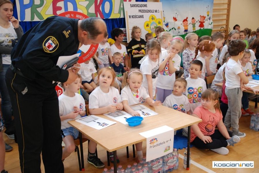 Areną zmagań dzieci z kościańskich przedszkoli i oddziałów przedszkolnych była hala Zespołu Szkół nr 2 w Kościanie. Na początek sześcioosobowe drużyny prezentowały baner z nazwą przedszkola, zaśpiewać piosenkę na temat bezpieczeństwa lub zdrowia. Następnie przeprowadzono quiz teoretyczny, w którym wiedzą i umiejętnościami na temat: pierwszej pomocy, zasad zachowania się na drodze, znajomością numerów alarmowych, zagrożeń ze strony dorosłych, zwierząt, urządzeń elektrycznych i zdrowej żywności popisywały się trzyosobowe drużyny. Był on przeplatany konkurencjami sportowymi dla całej drużyny (biegi, biegi na czworakach, rzuty do celu, przejście przez przeszkodą, wejście na drabinkę, bieg z bandażowaniem rannego). Zabawa była przednia.