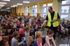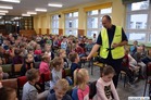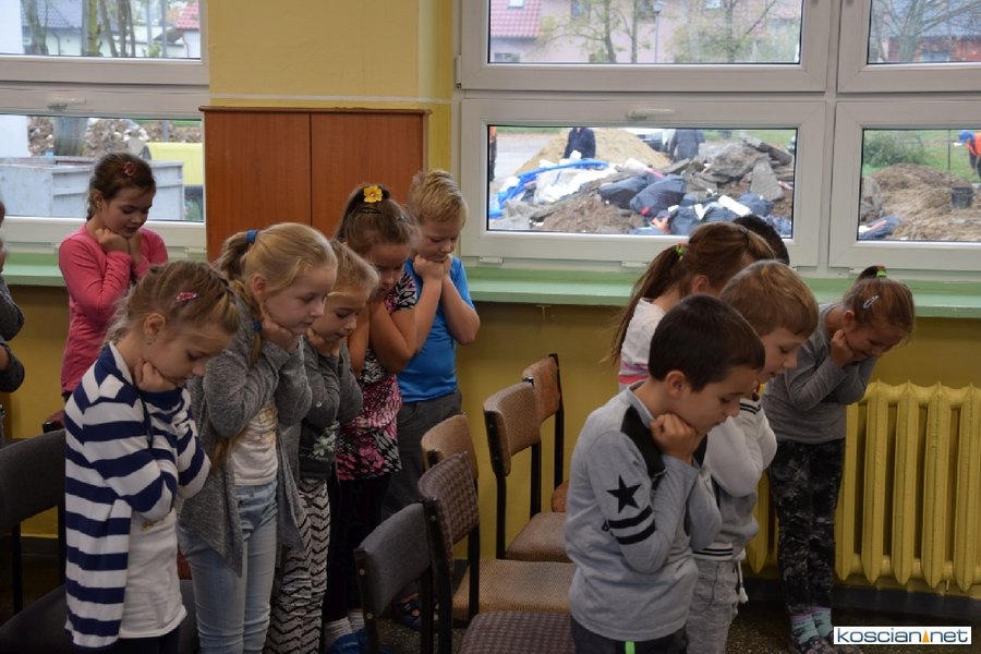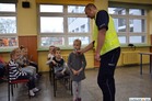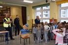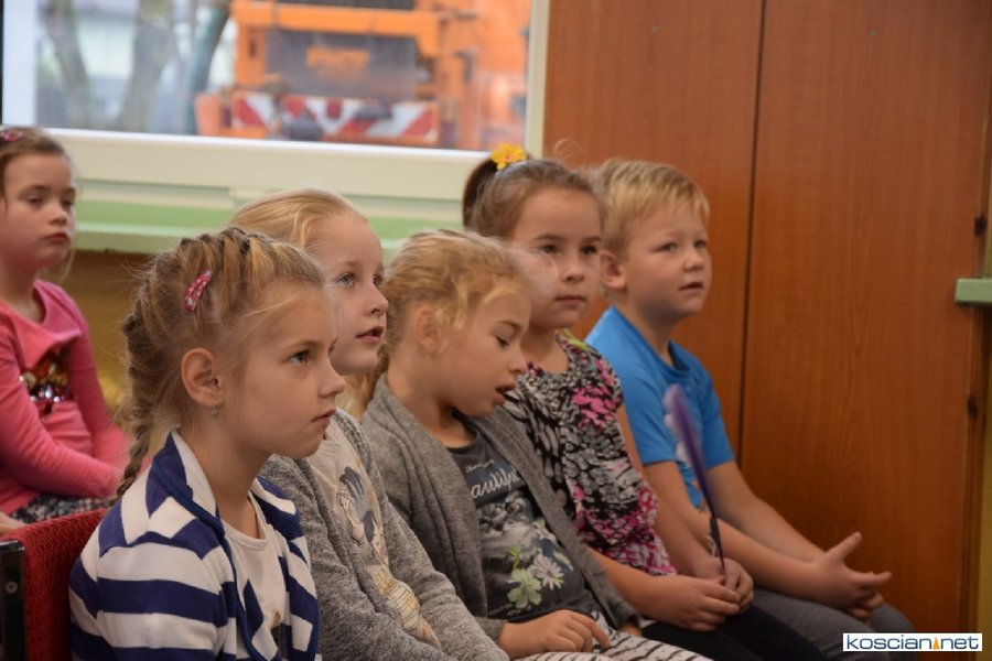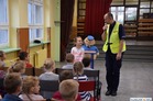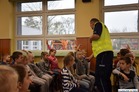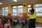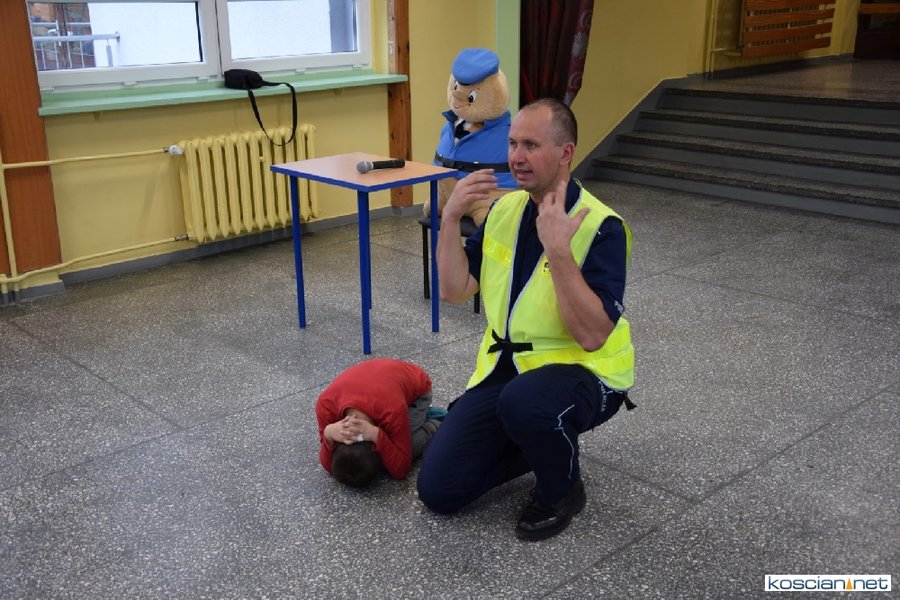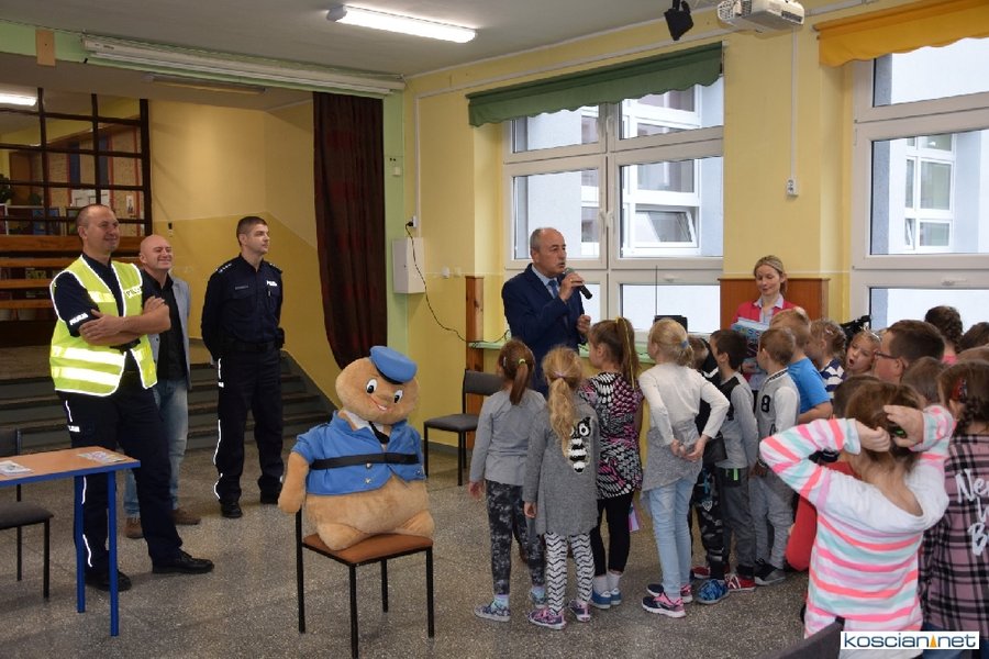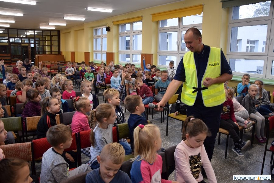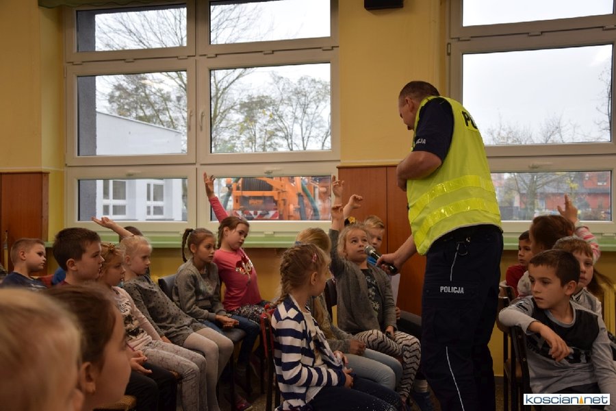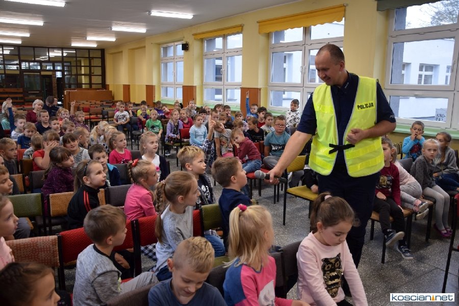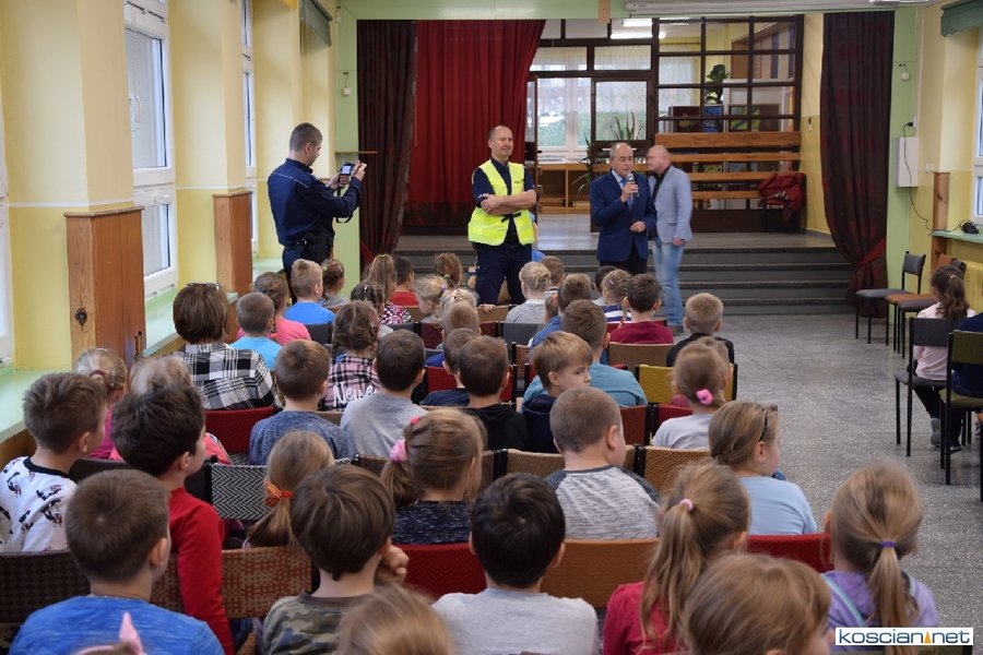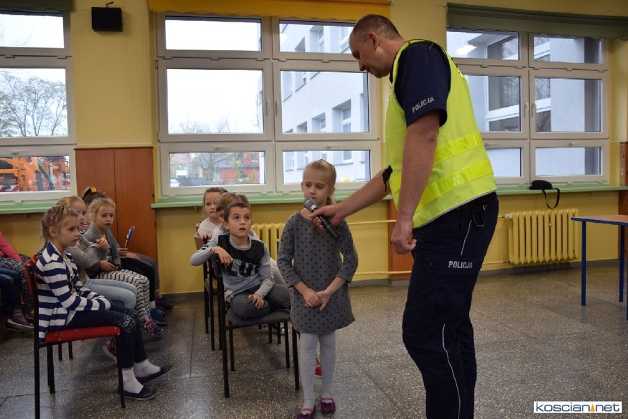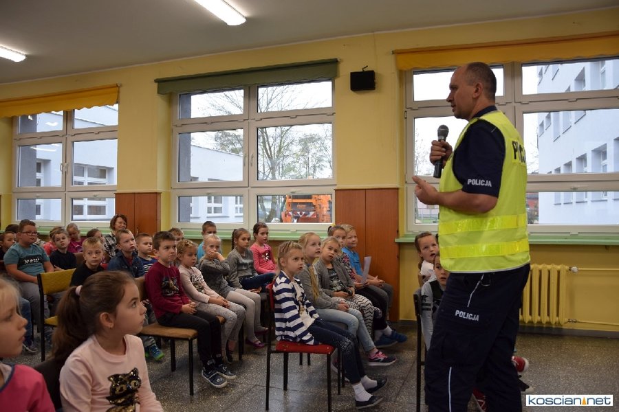 Podczas spotkania funkcjonariusz Komendy Powiatowej Policji w Kościanie asp. Marek Ludwiczak przeprowadził z uczniami pogadankę na temat zasad bezpieczeństwa na drodze, obowiązku zapinania pasów w samochodzie i zasad zachowania się w stosunku do obcych i agresywnych zwierząt.