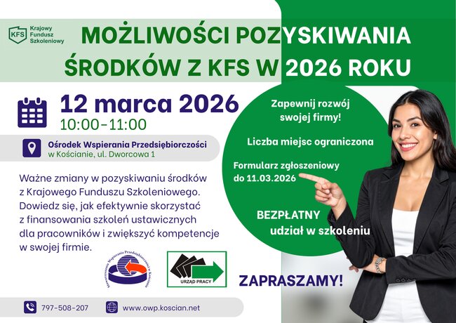 Stowarzyszenie Wspierania Przedsiębiorczości w Kościanie wraz z Powiatowym Urzędem Pracy w Kościanie zapraszają na bezpłatne szkolenie, podczas którego omówione zostaną najważniejsze zmiany w przepisach oraz praktyczne wskazówki dotyczące składania wniosków i korzystania ze środków KFS.