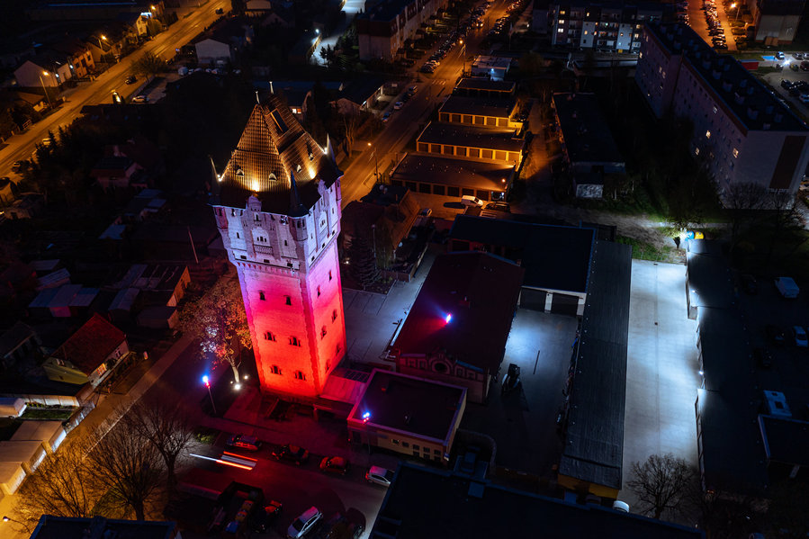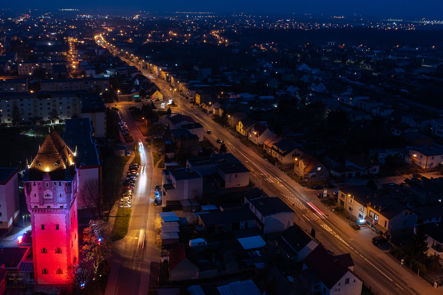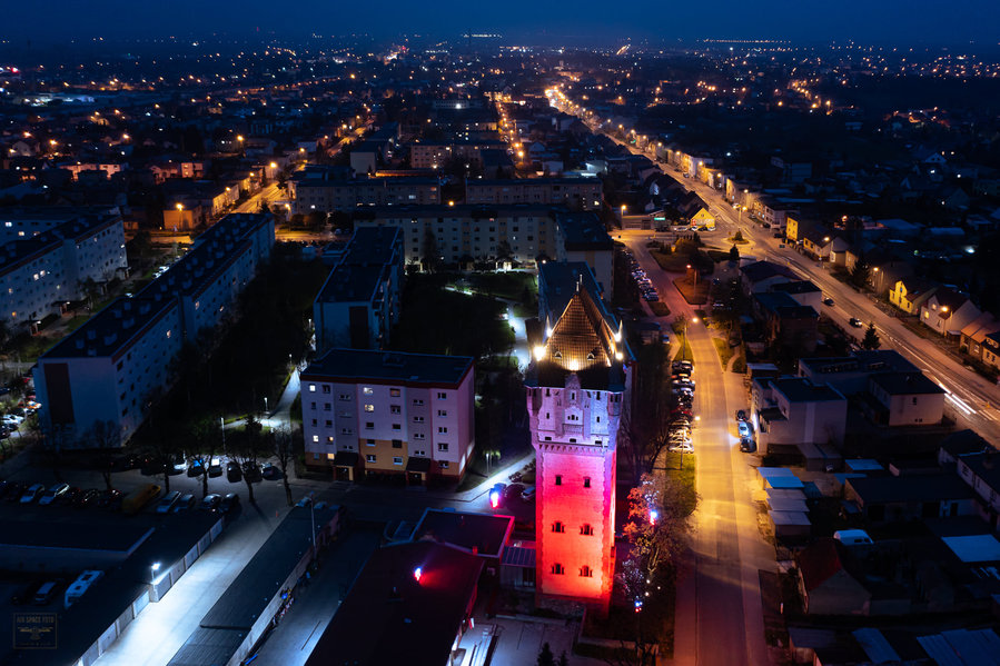 Latająca kamera Air Space Foto spojrzała na wieżę ciśnień wieczorem 1 maja. Barwy narodowe będą zdobić wieżę także w Dniu Flagi Rzeczypospolitej Polskiej oraz w Święto Narodowe Trzeciego Maja.