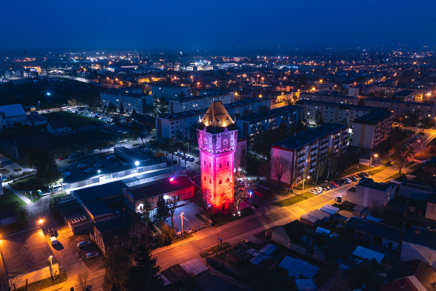 W świąteczny weekend majowy kościańska wieża ciśnień podświetlana jest w barwach narodowych.