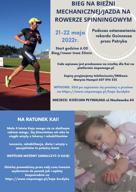 W przyszłym tygodniu Patryk Hampel podejmie w Kościanie próbę bicia rekordu Guinnessa w potrójnym Ironmanie na hali. Wydarzeniu będzie towrzyszył bieg charyrtatywny dla Kai z Kościana.