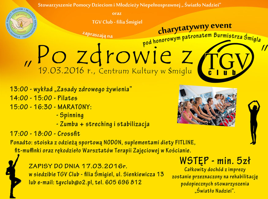 W sobotę, 19 marca, w Centrum Kultury w Śmiglu odbędzie się impreza "Po zdrowie z TGV Club", z której dochód zostanie przeznaczony na rehabilitację podopiecznych Stowarzyszenia Pomocy Dzieciom i Młodzieży Niepełnosprawnej "Światło Nadziei".