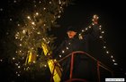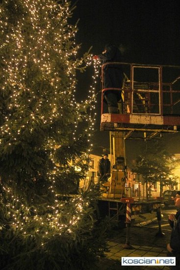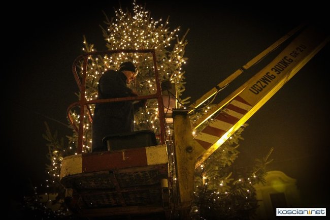 W południe rozpoczęło się strojenie choinki siedmioma tysiącami światełek. Jak co roku „choinkowemu” pomaga w tym Mariusz Odważny oraz operator podnośnika koszowego. Późnym wieczorem ustrojone przez nich drzewko jest gotowe.