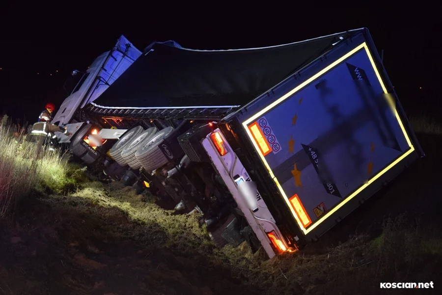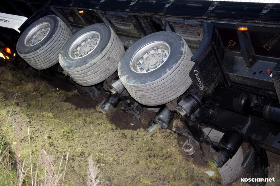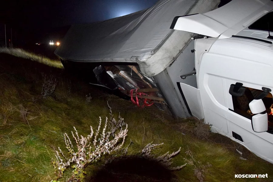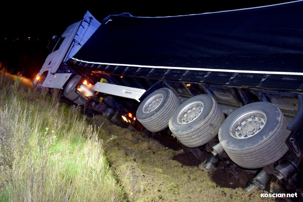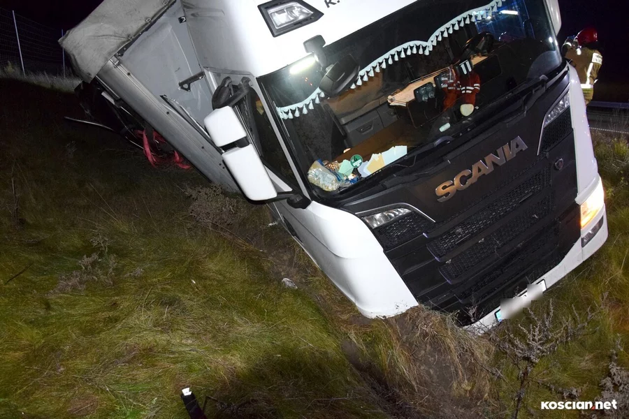 Do zdarzenia doszło w środę, 15 listopada, około godziny 20:25, na drodze ekspresowej nr 5, w pobliżu węzła Kościan Południe, na pasie prowadzącym w kierunku Poznania. Scania z naczepą wjechała do rowu. Kierowca nie odniósł obrażeń i nie potrzebował pomocy medycznej. Został ukarany mandatem.
