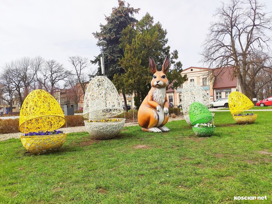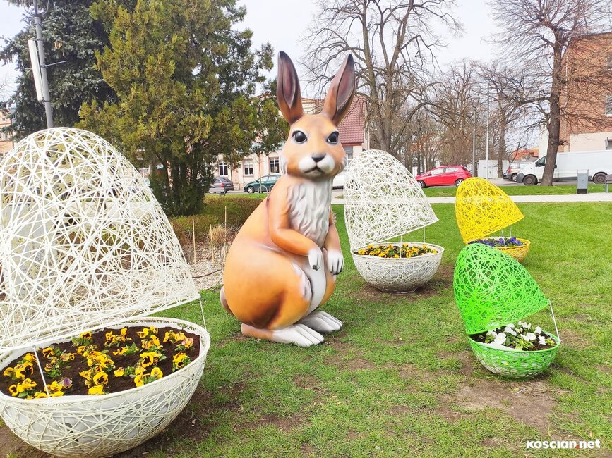 Na Plac Wolności w Kościanie powrócił wielkanocny zając. Tak jak przed rokiem przykucnął obok ażurowych pisanek z kwitnącymi bratkami.