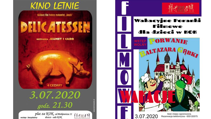 Tego samego dnia wieczorem w placu za KOK odbędzie się drugi seans Kina Letniego. Tym razem, na dużym ekranie będzie można obejrzeć francuski film „Delikatesy”. To dziejąca się w niedalekiej przyszłości, surrealistyczna opowieść o mieszkańcach pewnej kamienicy. Wszyscy są klientami znajdujących się na parterze Delikatesów, których zapasy w mięso rosną wraz ze zniknięciem kolejnego lokatora kamienicy. Pewnego dnia do kamienicy przybywa Louison (Dominique Pinon), młody bezrobotny artysta cyrkowy, którego właściciel kamienicy i Delikatesów zatrudnia jako złotą rączkę. Czy przed rzeźnickim nożem uchroni go miłość Julie, córki bezwzględnego rzeźnika? Początek filmy o godzinie 21.30. W razie deszczu seans dobędzie się w sali KOK. Wstęp bezpłatny.