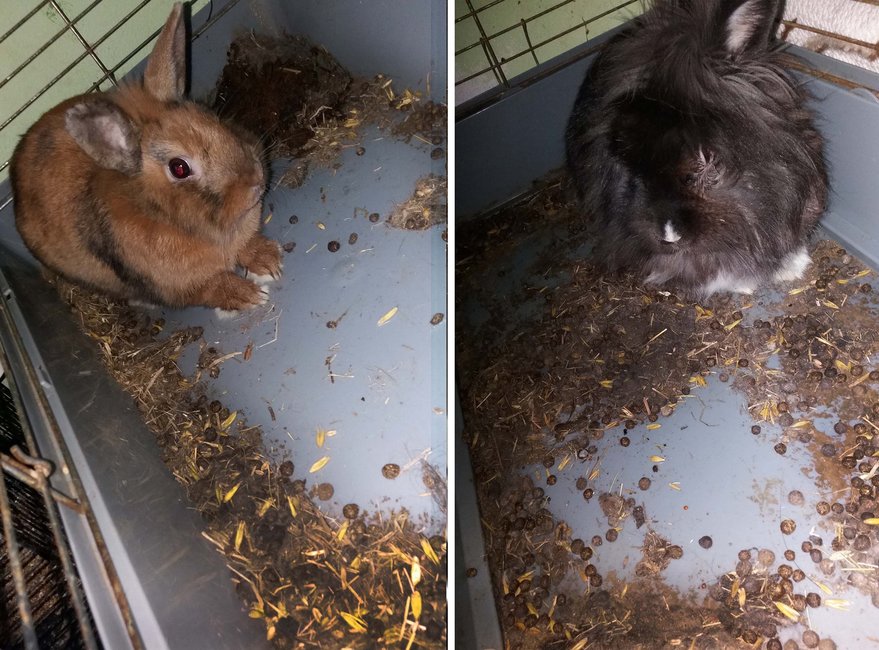 Króliki i świnka morska przebywały w zepsutych popękanych klatkach, na grubej warstwie starych gnijących odchodów, bez dostępu do wody i jedzenia.