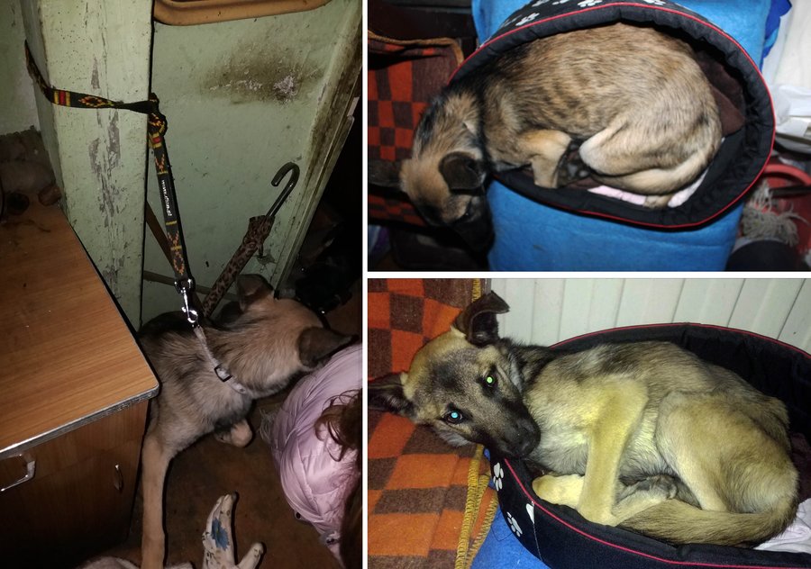 Najgorzej jednak sprawa miała się z psami. Większość z nich była krytycznie wychudzona, spod skóry wystawały żebra i kręgosłupy. Jeden z psów uwiązany był tak ciasno i wysoko, że nie miał możliwości stanąć na 4 łapach! WISIAŁ W POWIETRZU desperacko szukając podparcia. Kolejny przebywał w KOSZU NA PRANIE! Pełnym zaschniętych, starych odchodów, oczywiście również bez wody. Następny w maleńkim transporterze, kolejny szczeniak w niewielkiej klatce. Każdy z nich brodził w odchodach (...). Wszystkie zwierzaki trzymane w zamknięciu zachowywały nienaturalną pozycję ciała. Szczeniak doznał przykurczu mięśni! Świadczy to o tym, że takie przetrzymywanie nie było chwilowe. (...)