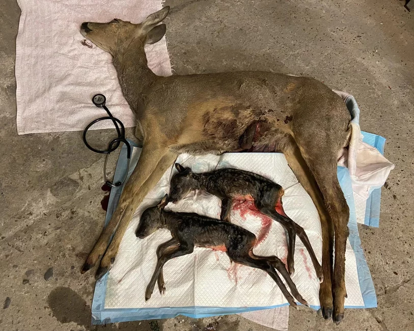 Przerażonym ludziom udało się odgonić psa i od razu szukali dla niej pomocy. Na miejsce nasza Paulina dotarła po kilku minutach, niestety sarna zdążyła odejść… Od razu widać było, że jest kotna. Natychmiast transport i cesarskie cięcie, próba ratowania koźląt - urodziłyby się lada chwila. Niestety było już za późno, reanimacja nie przyniosła efektu napisano na stronie Ośrodka Rehabilitacji Dzikich Zwierząt w Kościanie.