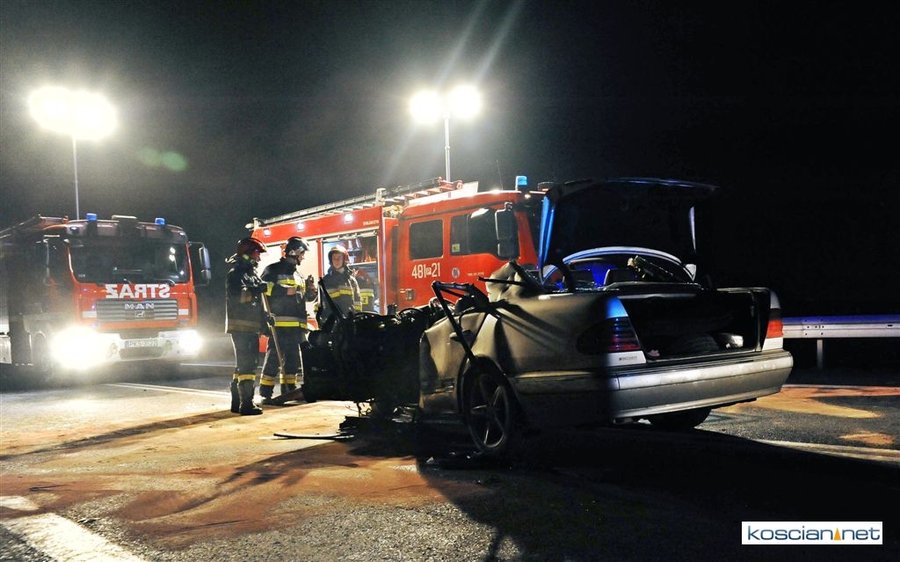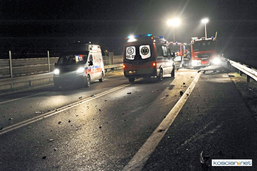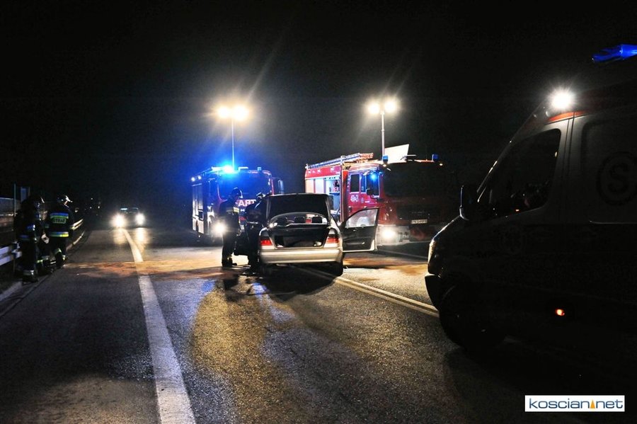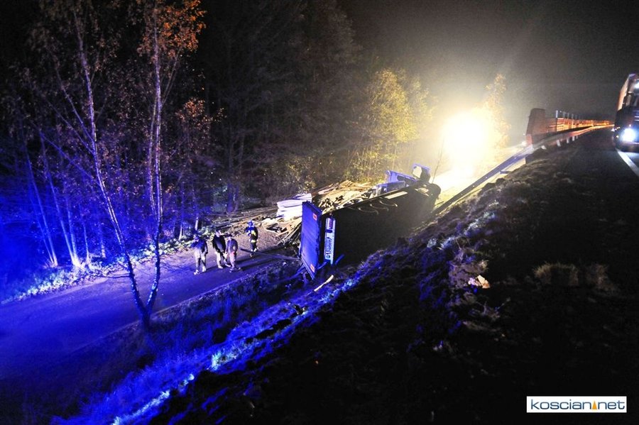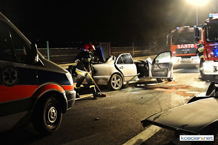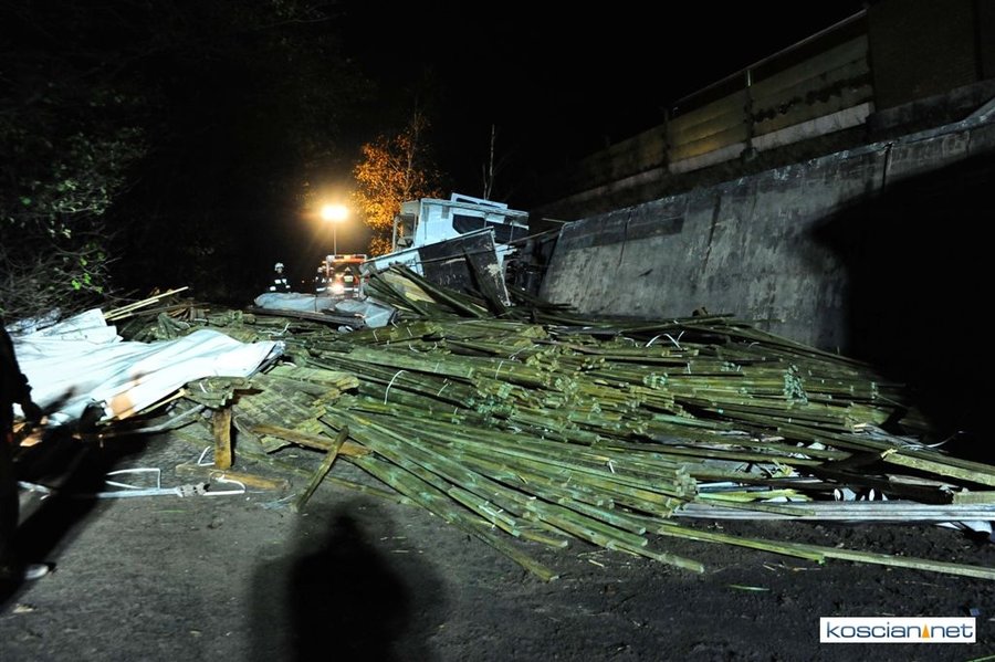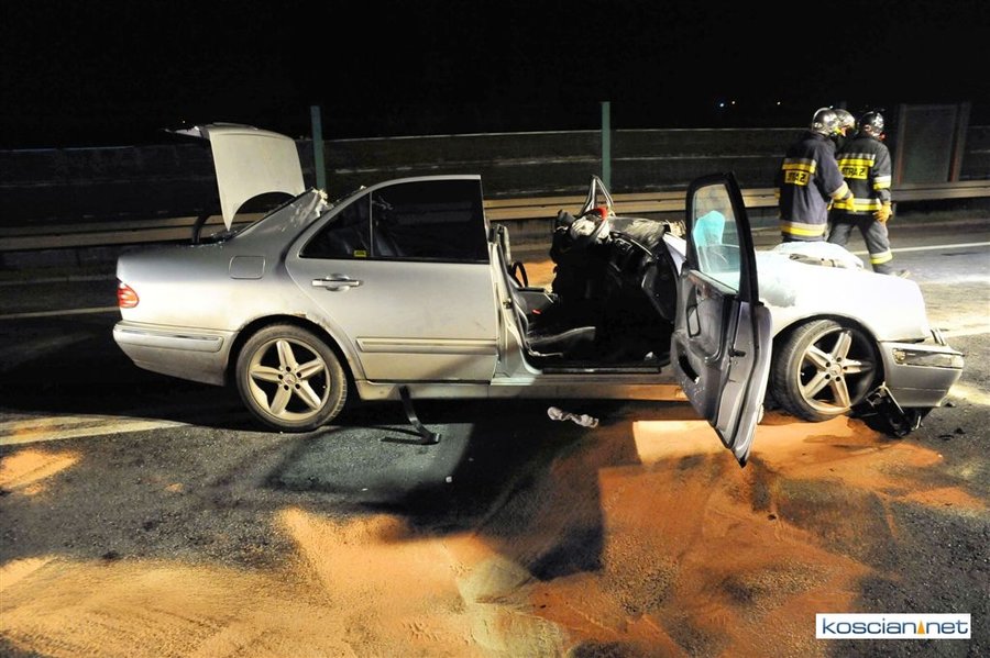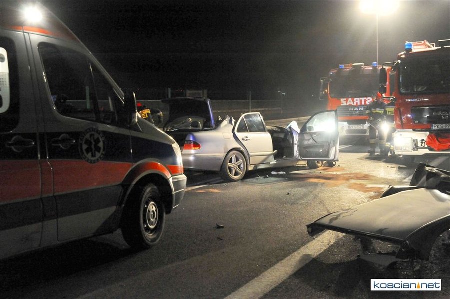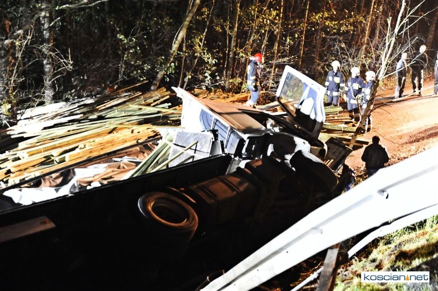 Do wypadku doszło przed godziną 17. Jak wynika ze wstępnych ustaleń jadący w kierunku Kościana mercedes, prowadzony przez 31-letniego mieszkańca powiatu kościańskiego, zjechał na przeciwny pas ruchu i uderzył w koło jadącego w kierunku Leszna samochodu ciężarowego. Załadowana kilkudziesięcioma metrami sześciennymi drewnianych łat ciężarówka uderzyła w bariery energochłonne i stoczyła się ze skarpy.