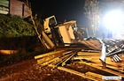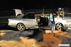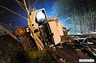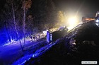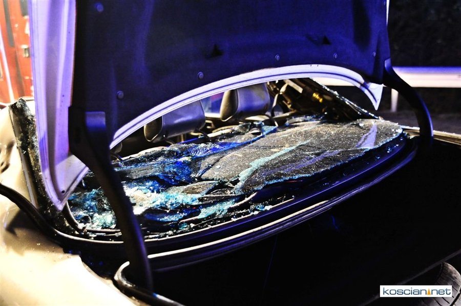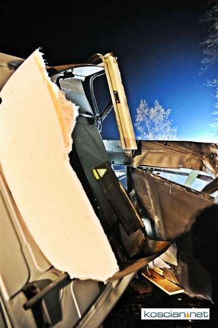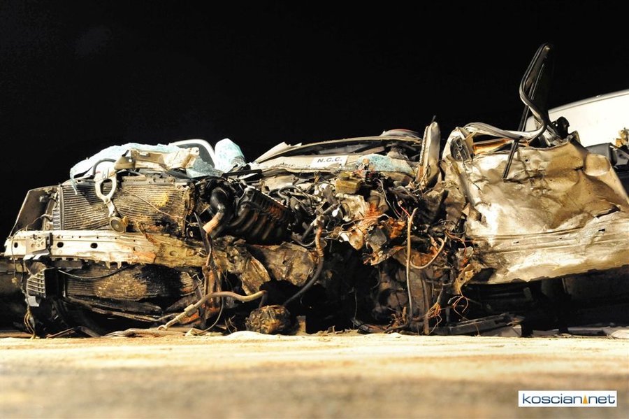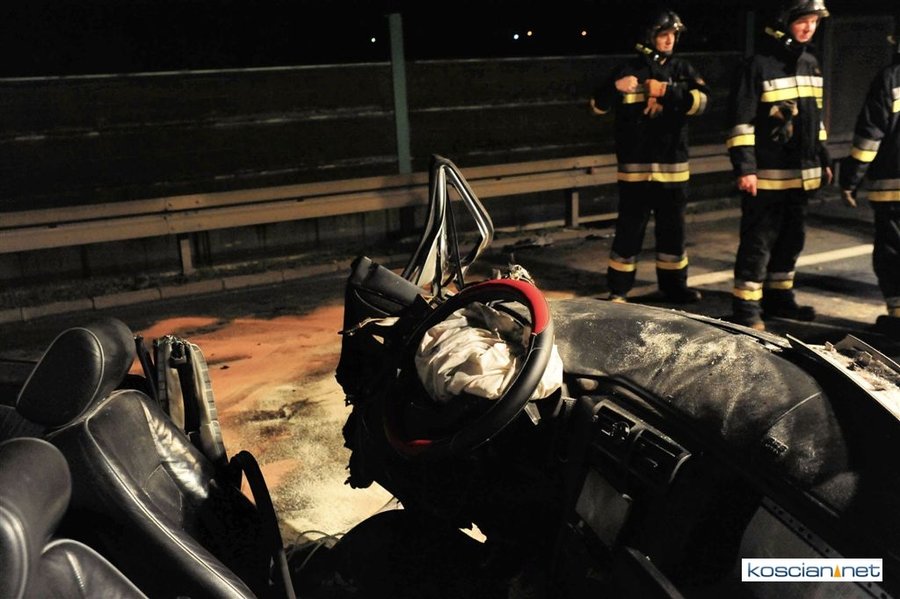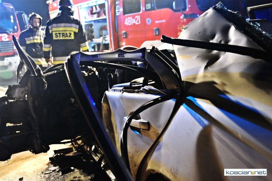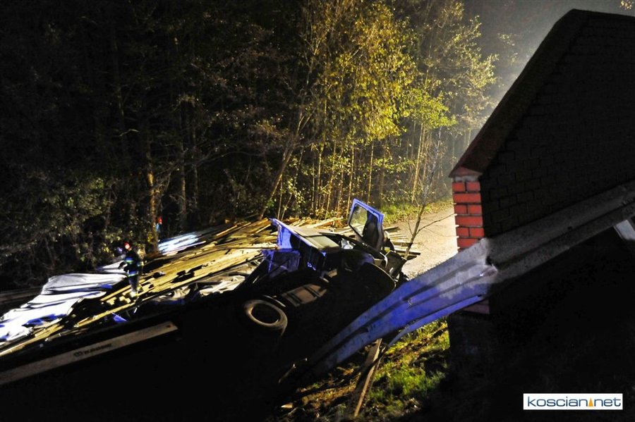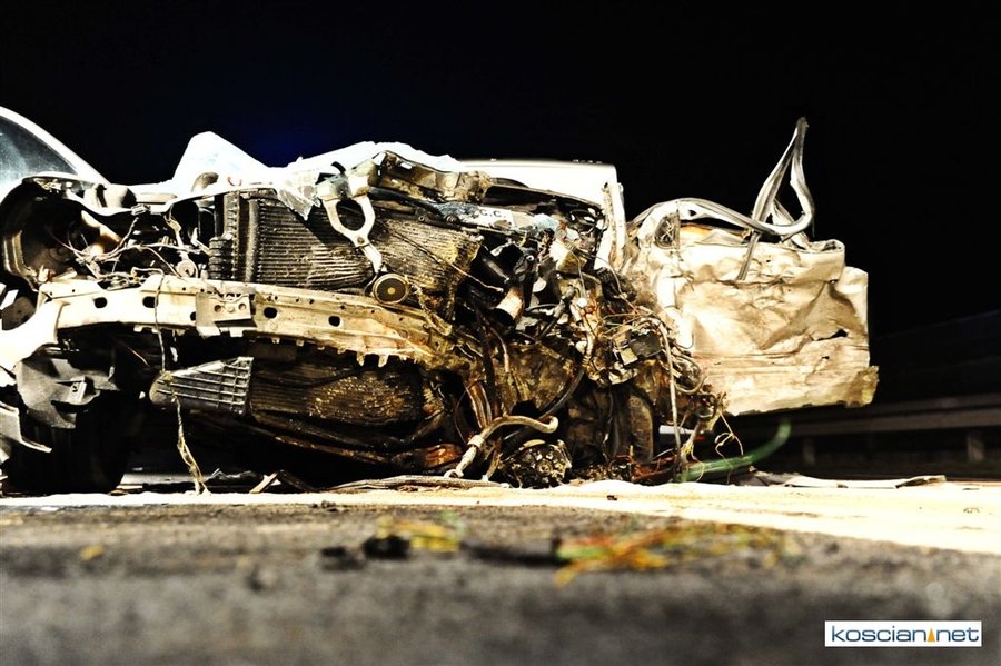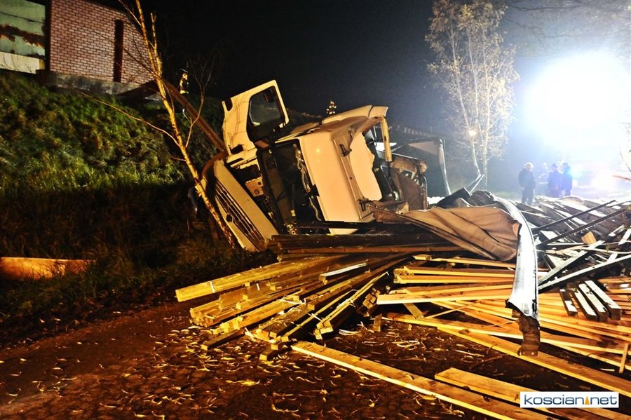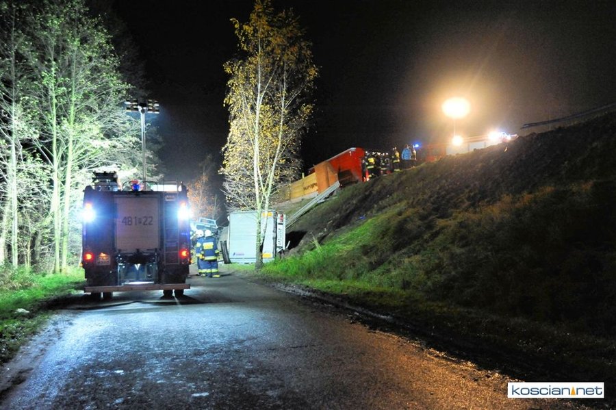 Do wypadku doszło przed godziną 17. Jak wynika ze wstępnych ustaleń jadący w kierunku Kościana mercedes, prowadzony przez 31-letniego mieszkańca powiatu kościańskiego, zjechał na przeciwny pas ruchu i uderzył w koło jadącego w kierunku Leszna samochodu ciężarowego. Załadowana kilkudziesięcioma metrami sześciennymi drewnianych łat ciężarówka uderzyła w bariery energochłonne i stoczyła się ze skarpy.