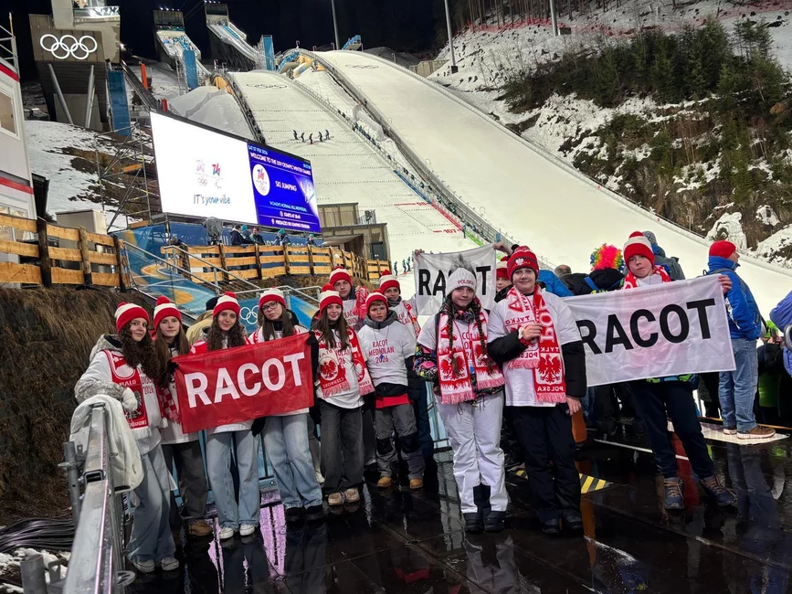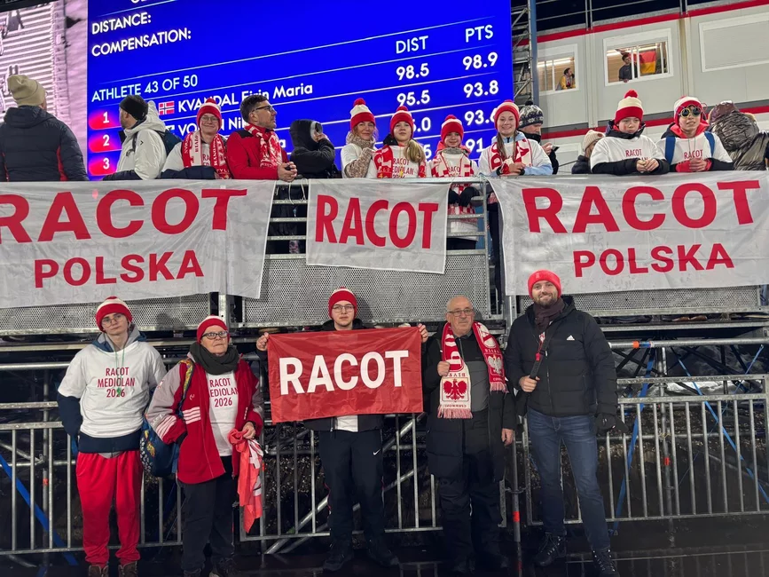 Kibice z Racotu, którzy w czwartek wyjechali do Mediolanu, wspierali dziś zawodniczki na skoczni w Predazzo. Ubrani w biało-czerwone stroje, koszulki z napisem „Racot Mediolan 2026” oraz wyposażeni w flagi z nazwą miejscowości, kibice z Racotu byli widoczni podczas transmisji telewizyjnych.