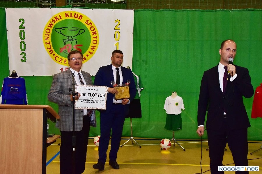 Włodarz gminy i przewodniczący Rady Miejskiej w Czempiniu Łukasz Grygier na ręce prezesa Mariana Kłosa przekazali okolicznościowy graweton i czek na tysiąc złotych.