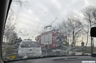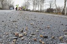 Co najmniej siedem samochodów uszkodziło wysypujące się z ciężarówki kruszywo.