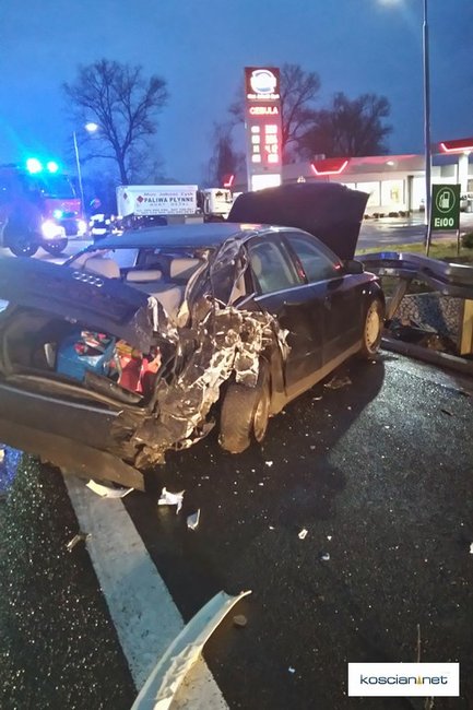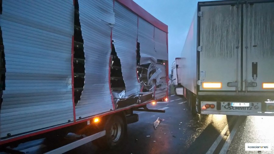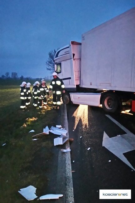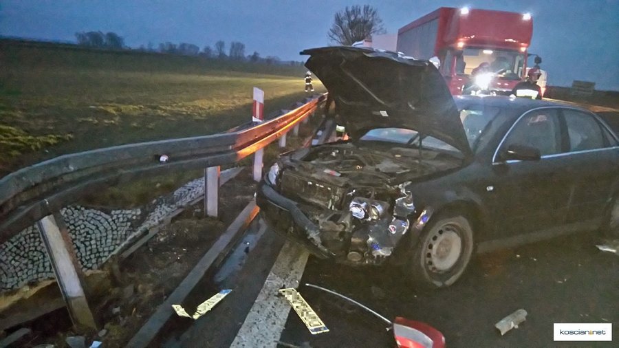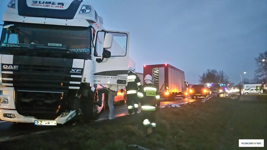 - Jadący w kierunku Poznania ciągnik siodłowy marki Daf, kierowany przez 32-letniego mieszkańca powiatu czarnkowskiego, najechał na tył samochodu audi skręcającego w lewo do stacji paliw. Następnie daf przemieścił się na przeciwległy pas ruchu i zderzył się z jadącym z przeciwnego kierunku samochodem ciężarowym marki MAN kierowanym przez 68-letniego mieszkańca powiatu ząbkowickiego – informuje Artur Ustasiak, oficer prasowy KPP w Kościanie.