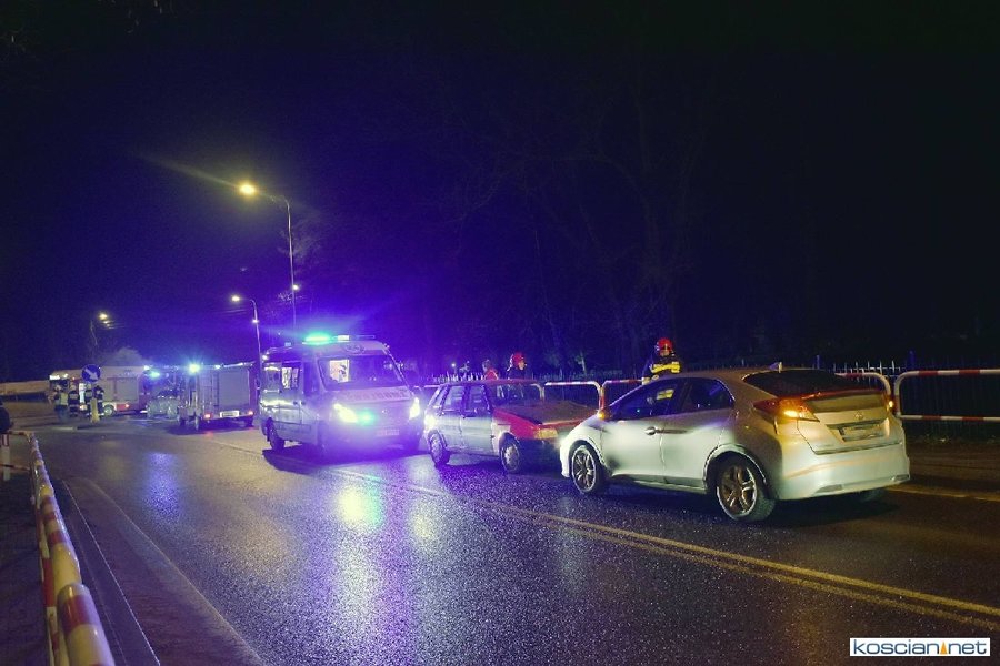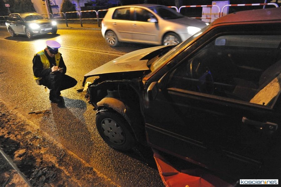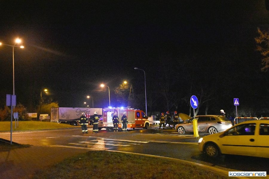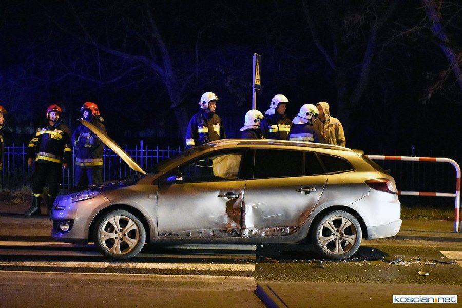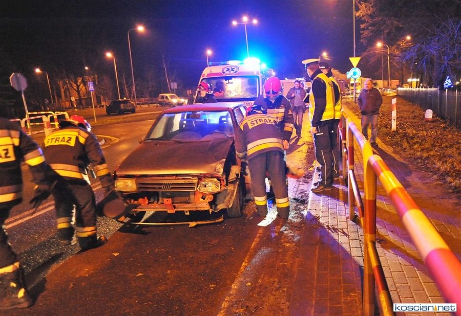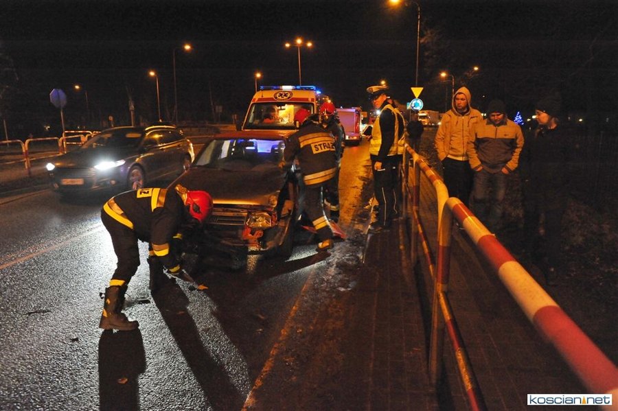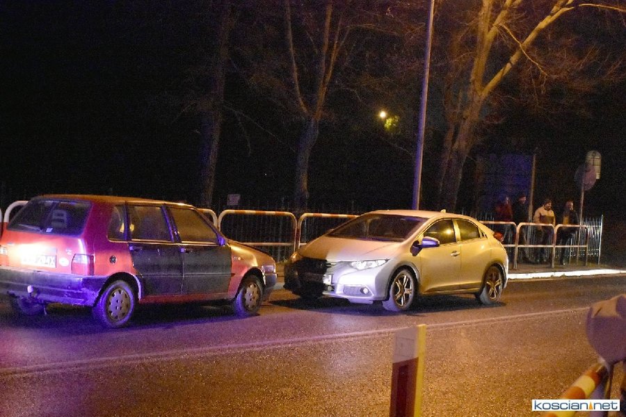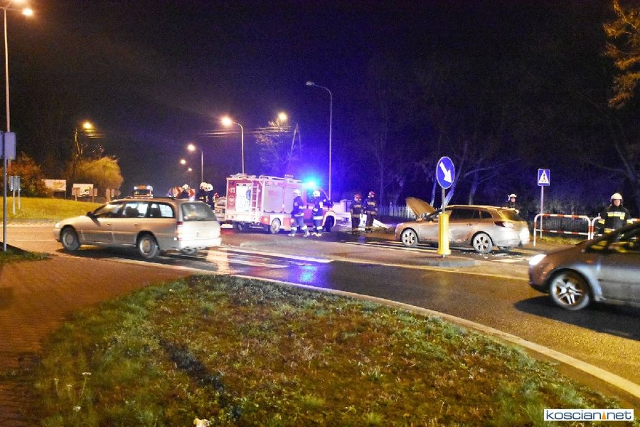 Do zdarzenia doszło wczoraj (21.12.2017) przed godziną 17. Wyjeżdżający z ronda w kierunku Poznania fiat uno przejechał wysepkę grodziową i uderzył w bok renault megane, jadącego w kierunku Kościana. Fiat kontynuując jazdę przeciwległym pasem doprowadził do czołowej kolizji z hondą. Z uwagi na małą prędkość pojazdów tylko jedna osoba uczestnicząca w kolizji doznała lekkich obrażeń.