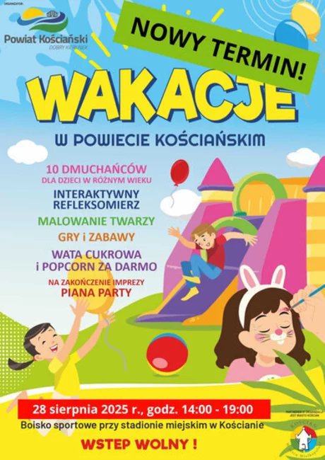 Na najmłodszych czekać będzie szereg atrakcji – 10 dmuchańców, interaktywny refleksomierz, malowanie twarzy, gry i zabawy, wata cukrowa i popcorn dla wszystkich dzieci, a na zakończenie imprezy piana party. Wstęp na wydarzenia jest bezpłatny! Partnerem imprezy kończącej wakacje jest samorząd Miasta Kościana.