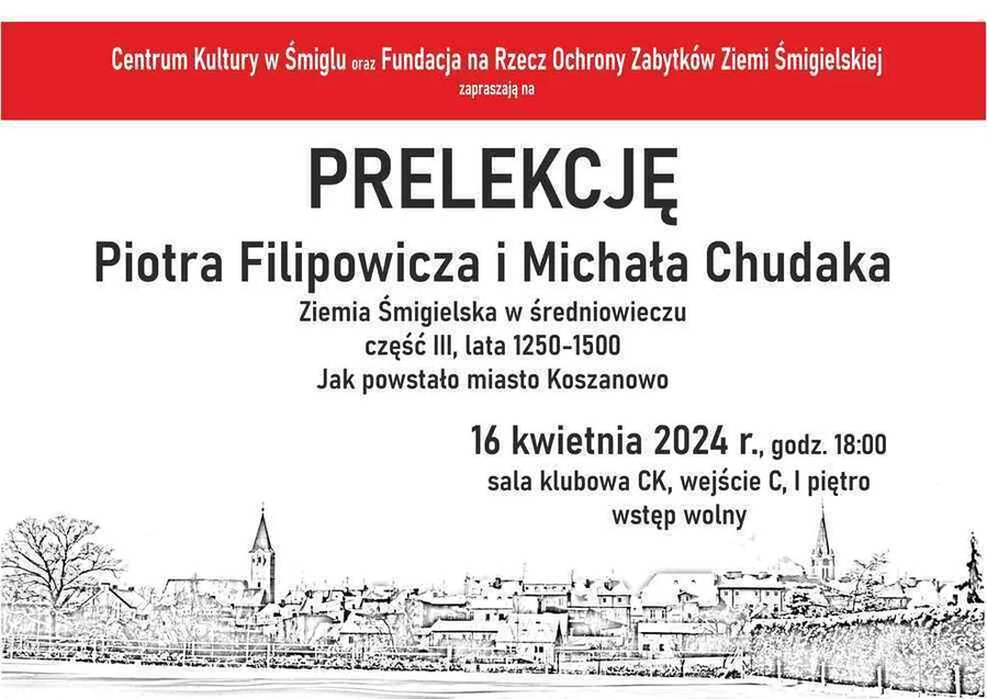 We wtorek, o godzinie 18:00, w Sali klubowej Centrum Kultury odbędzie się trzecia prelekcja Piotra Filipowicza i Michała Chudaka z cyklu „Ziemia Śmigielska w średniowieczu”. Poświęcona będzie latom 1250-1500 i nosi tytuł „Jak powstało miasto Koszanowo”. Wstęp wolny.
