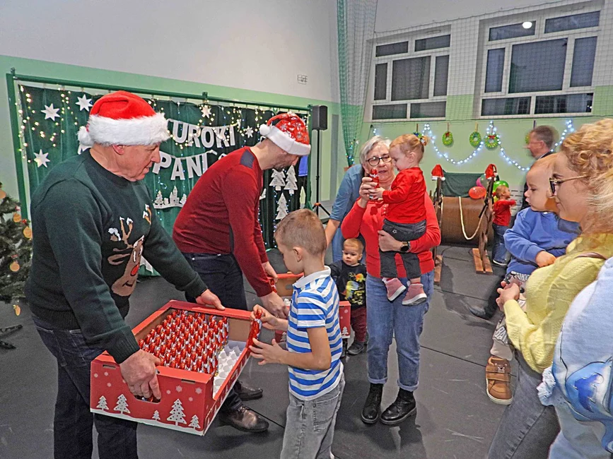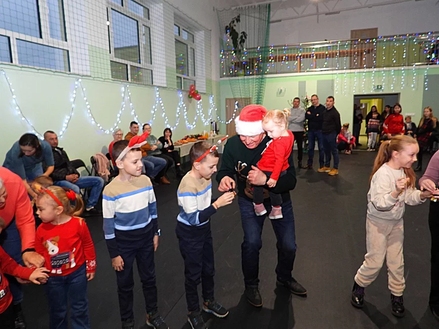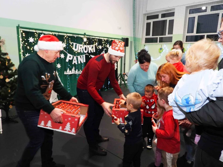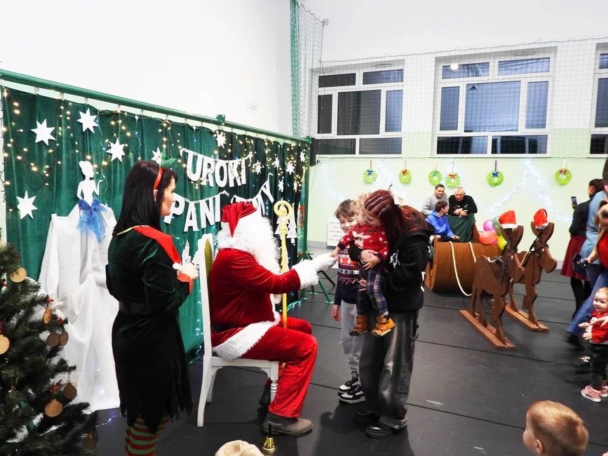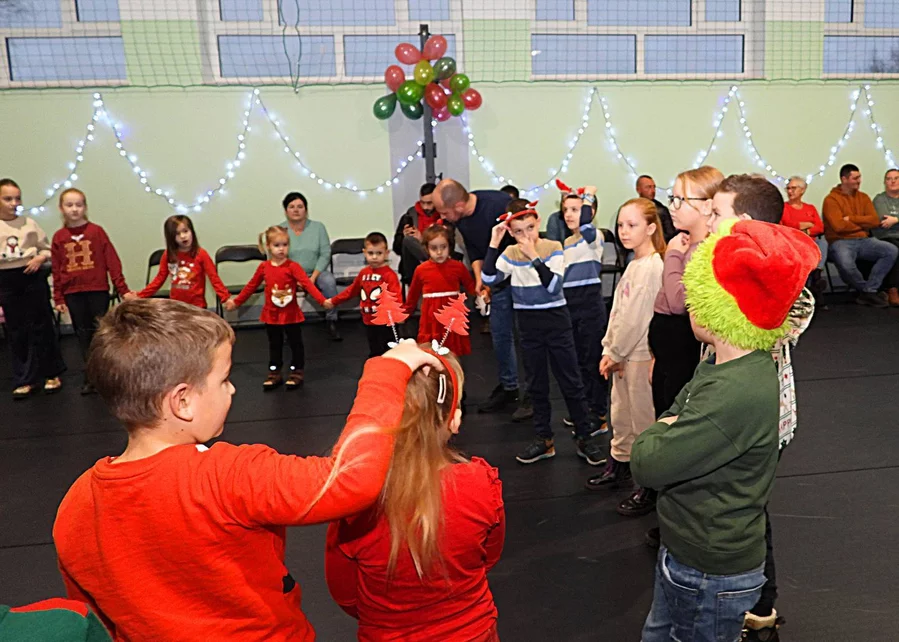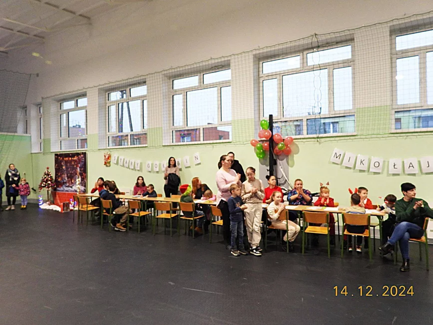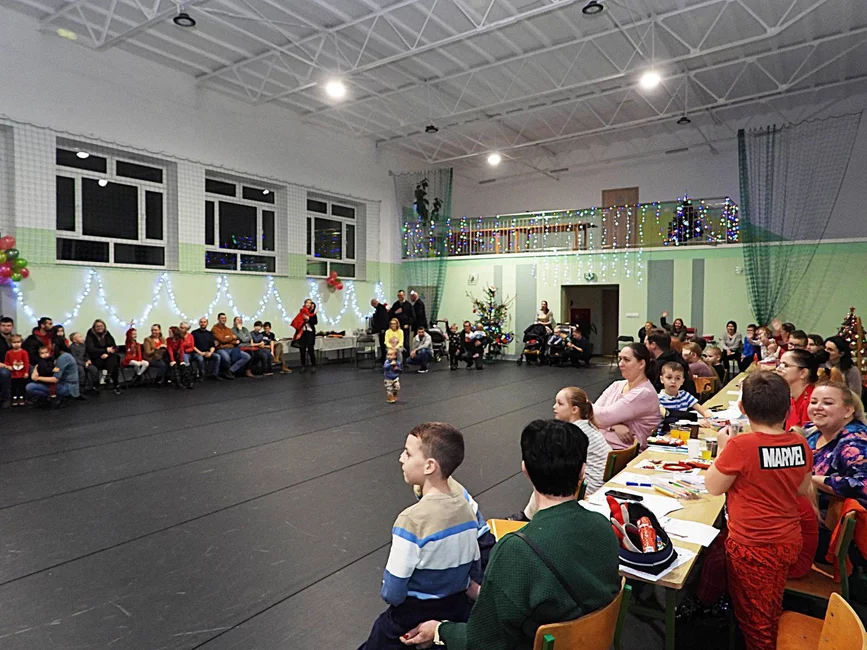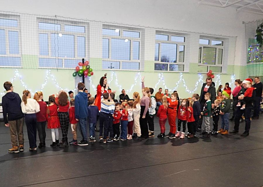 Fotorelacja z mikołajek zorganizowanych przez sołtysa, radę rodziców i miejscową OSP w szkolnej hali sportowej.