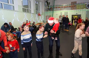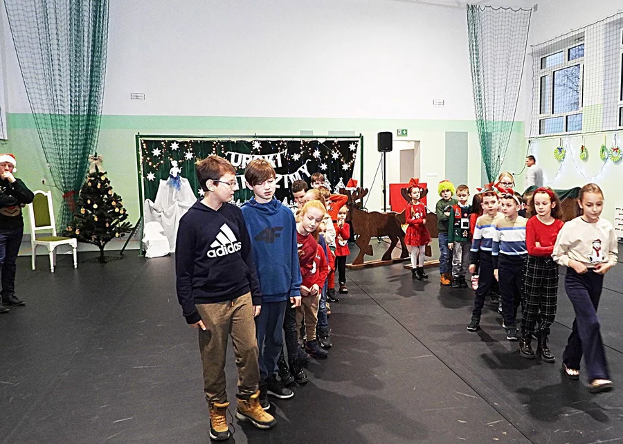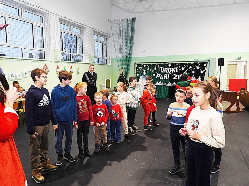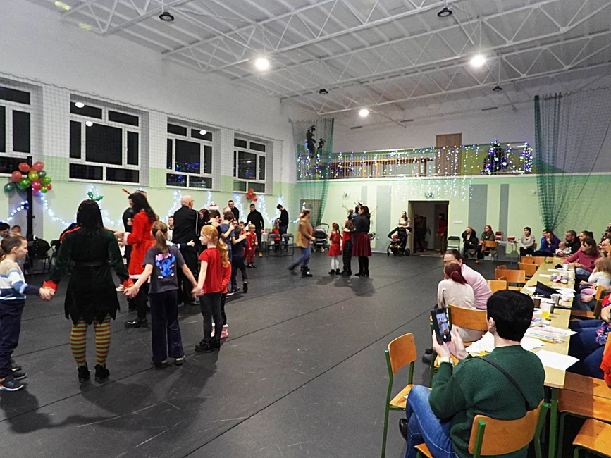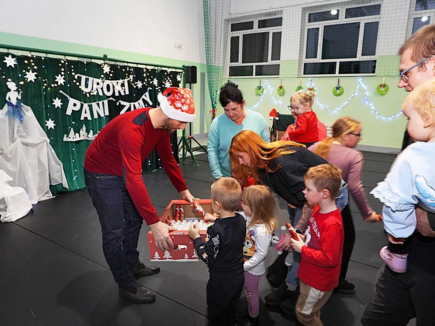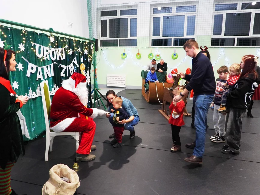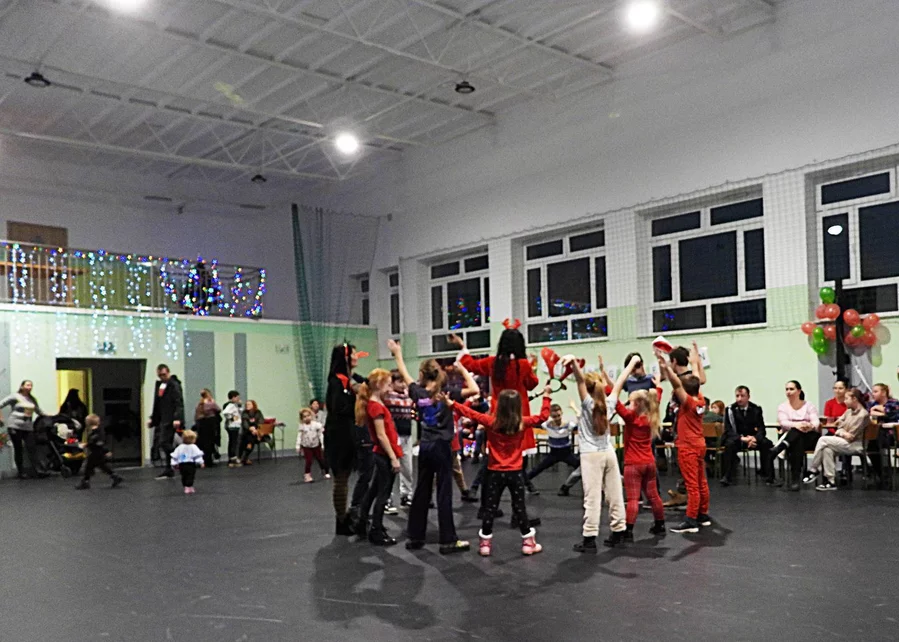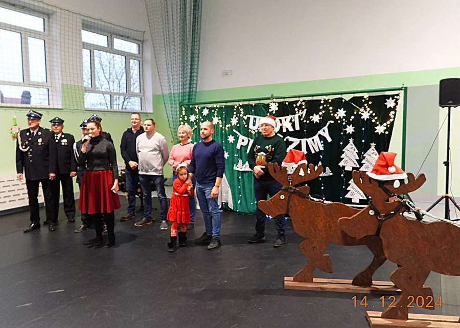Fotorelacja z mikołajek zorganizowanych przez sołtysa, radę rodziców i miejscową OSP w szkolnej hali sportowej.