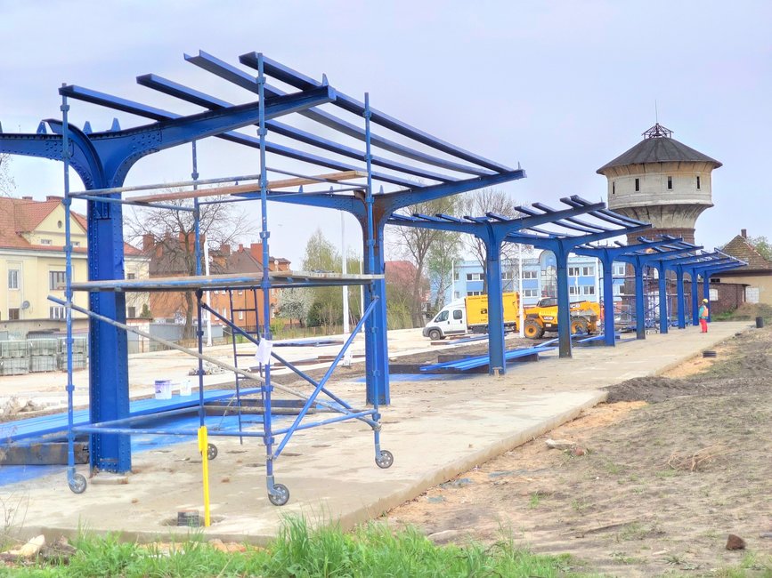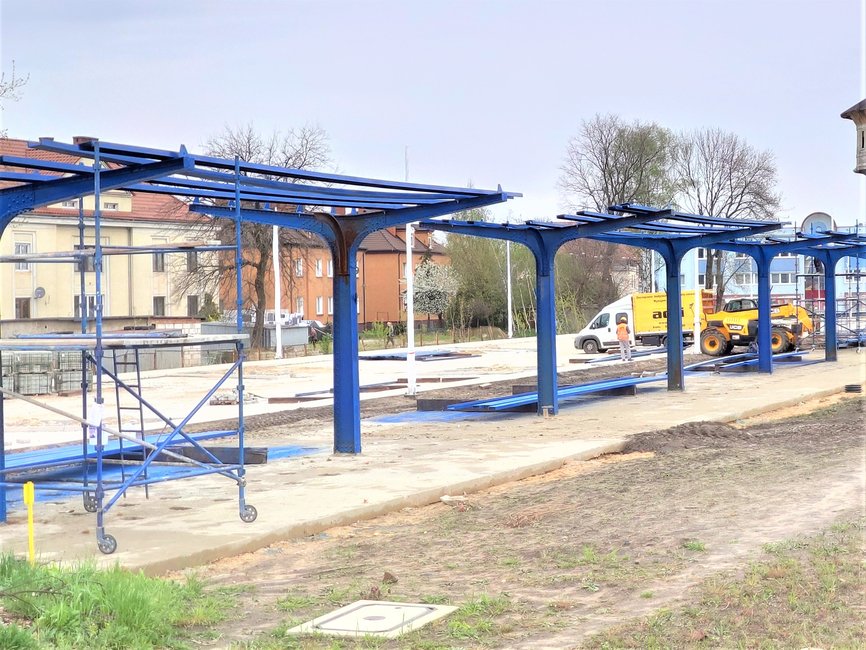 Trwa montaż zabytkowej wiaty na parkingu powstającym w sąsiedztwie kościańskiego dworca kolejowego.