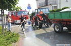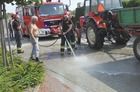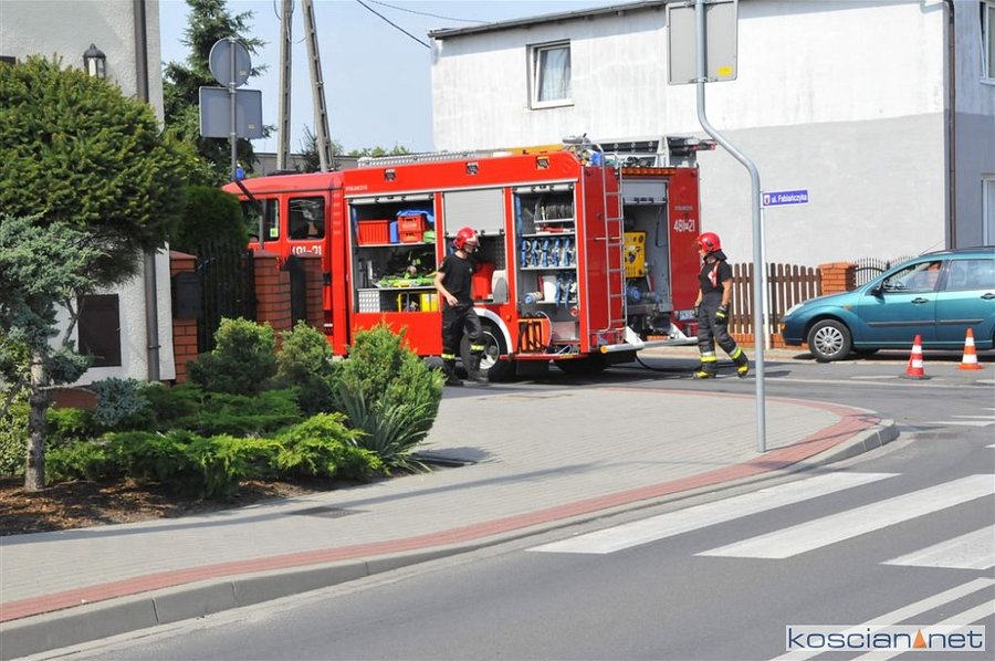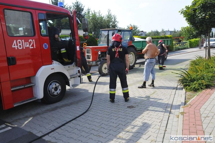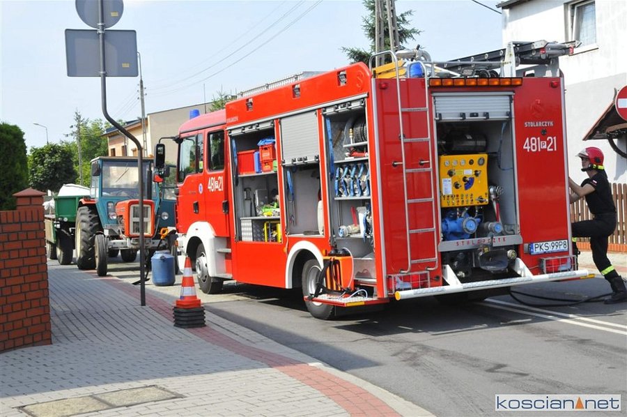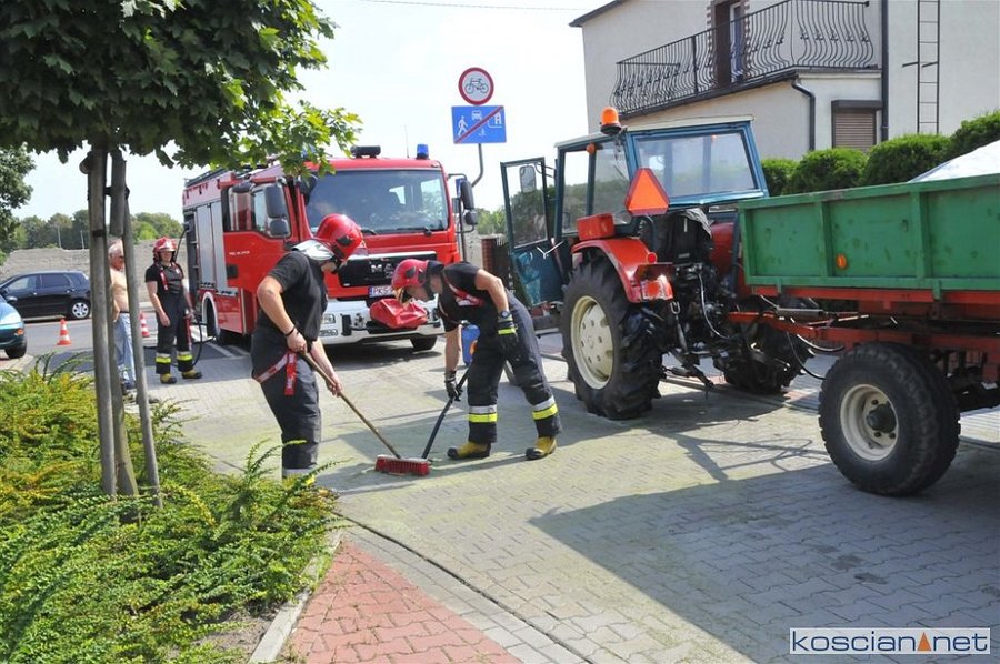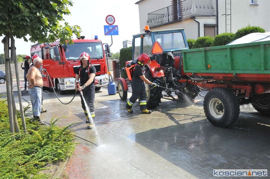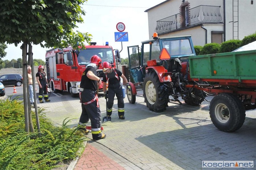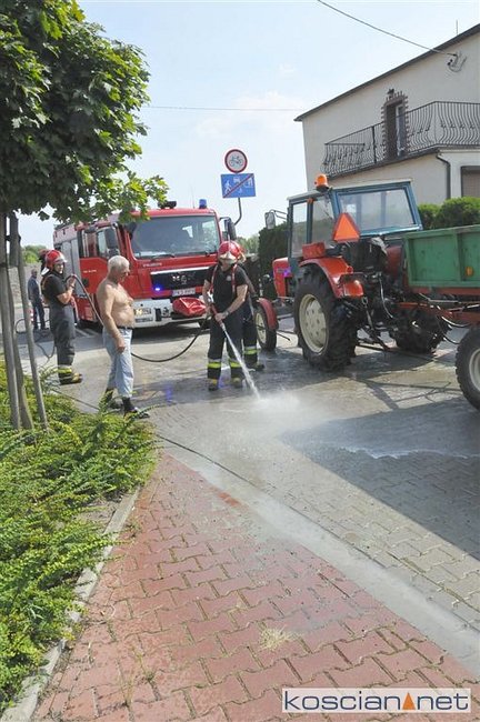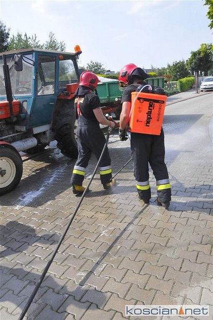 Kościańscy strażacy usuwali dziś z jezdni na ulicy Fabiańczyka w Kościanie paliwo, które wyciekło z rolniczego ciągnika.