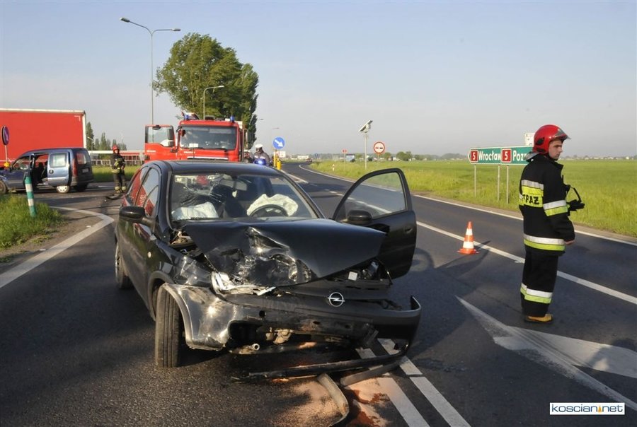 Przy wyjeździe z Kościana na drogę krajową nr 5 zderzyły się dwa samochody osobowe.