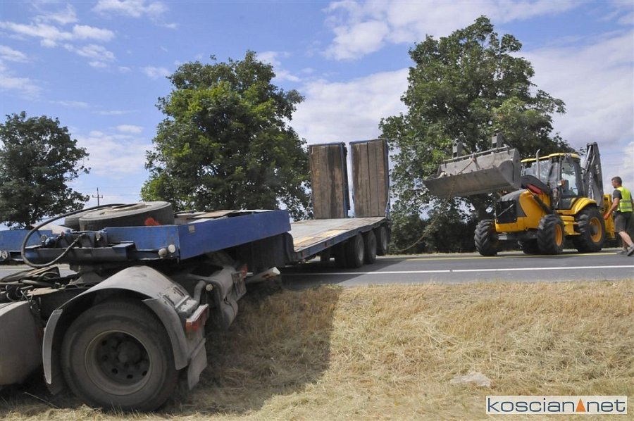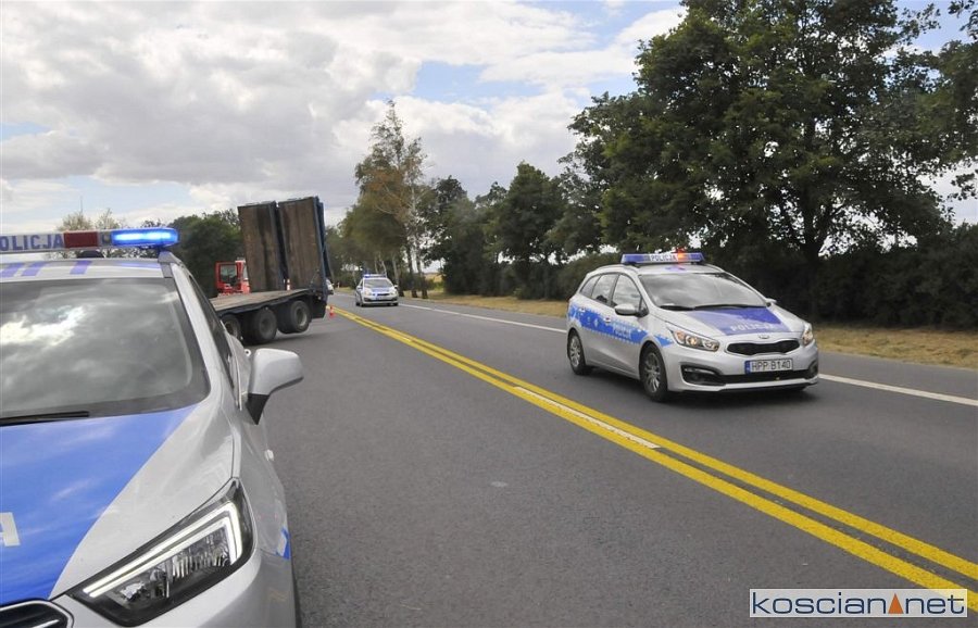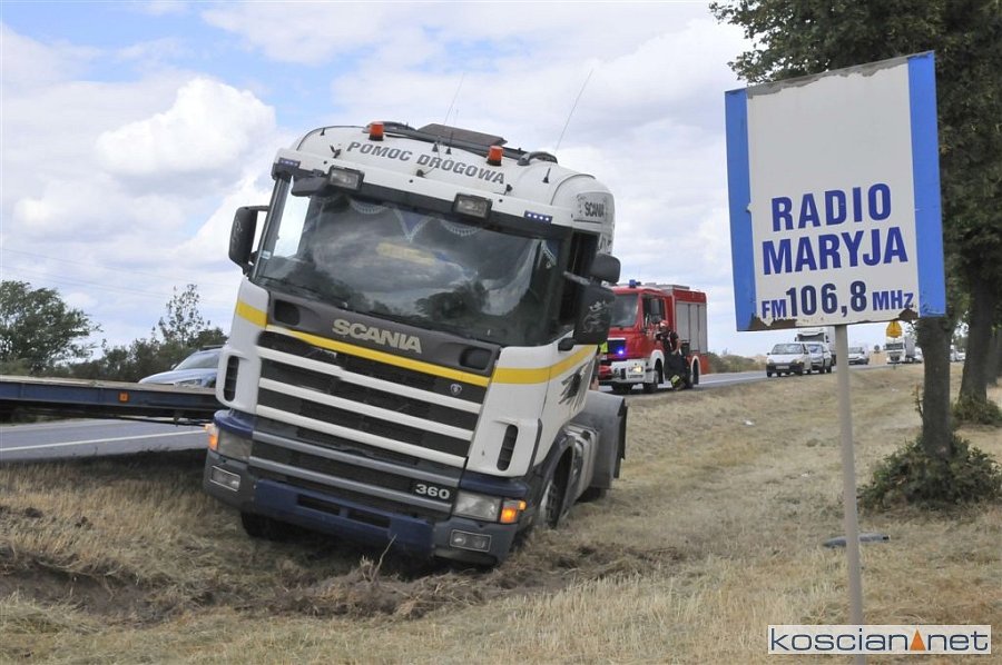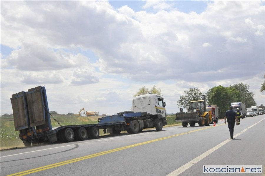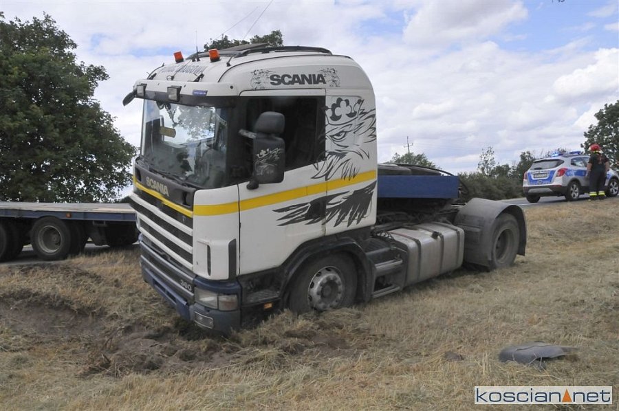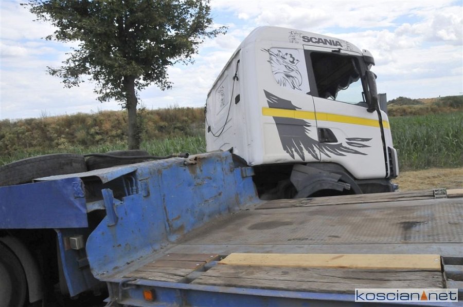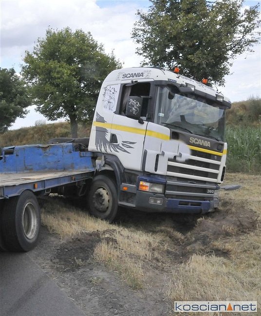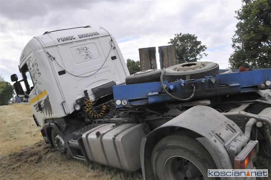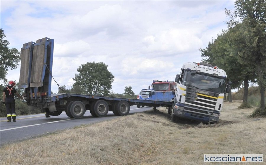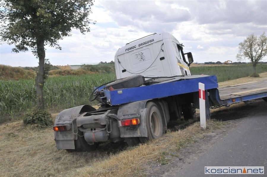 Do zdarzenia doszło we wtorek, 2 lipca, około godziny 13.45, na drodze krajowej nr 5 pomiędzy Czaczem a Poninem. Jak wynika ze wstępnych ustaleń, kierujący ciężarówką 28-letni mieszkaniec gminy Śmigiel ostro zahamował chcąc uniknąć zderzenia z poprzedzającym go pojazdem, który zaczął hamować. Prowadzony przez niego zestaw „złamał się” w wyniku czego ciągnik zjechał do rowu. W kolizji nikt nie ucierpiał.