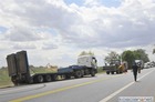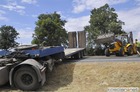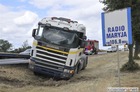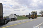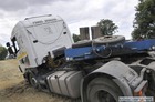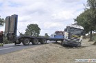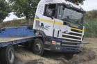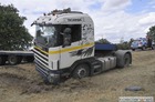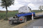 Po ostrym hamowaniu ciężarówka z lawetą zjechała do rowu.