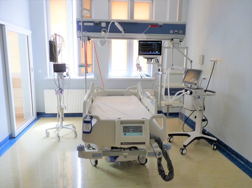 - łóżko szpitalne do intensywnej terapii (posiada wbudowany system ważenia pacjenta oraz regulację do przechyłów bocznych),
