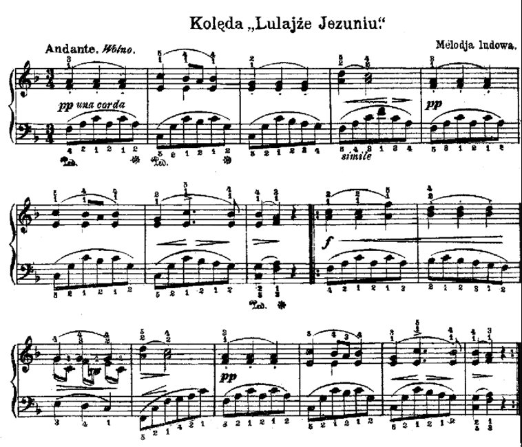To początek starej polskiej Kolędy, spisany ze śpiewnika ks. Michała Marcina Mioduszewskiego, zatytułowanego „Pastorałki i kolędy z melodyjami czyli piosnki wesołe ludu w czasie Świąt Bożego Narodzenia po domach śpiewane”, wydanego drukiem w Krakowie w 1843 r. Styl jakby współczesny, melodia znajoma, a autorzy nieznani. „