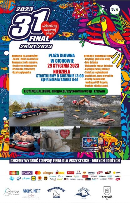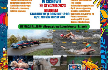 W programie: sauna i balia dla morsów, licytacja gadżetów, foto ścianka, malowanie twarzy, kącik pierwszej pomocy, stoiska z regionalnym wypiekami, zupą i pierogami, pokazy ratownictwa wodnego OSP Krzywiń, ognisko z kiełbaskami.