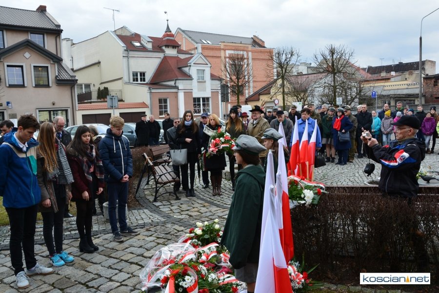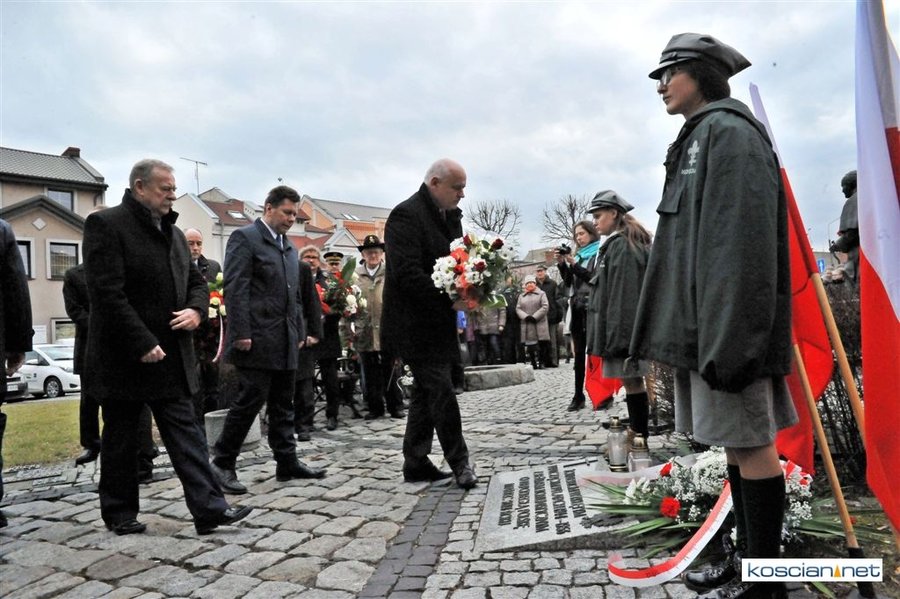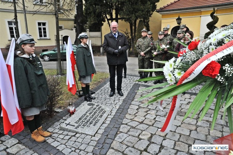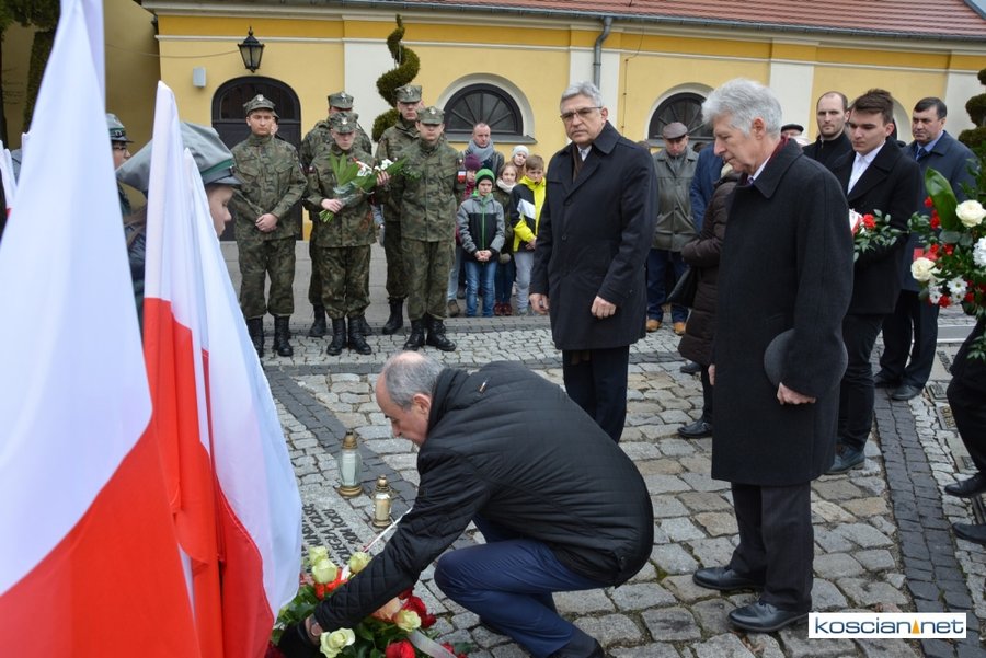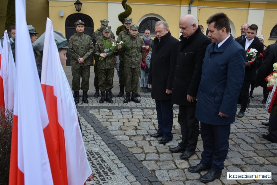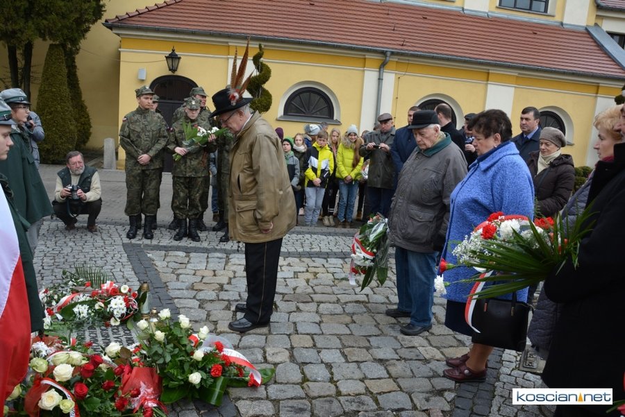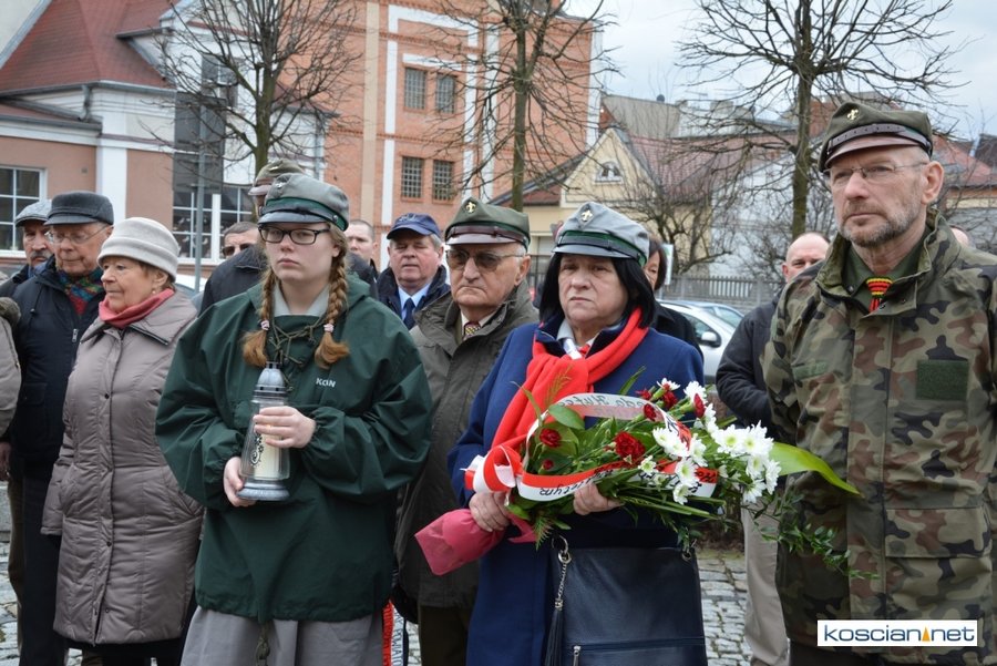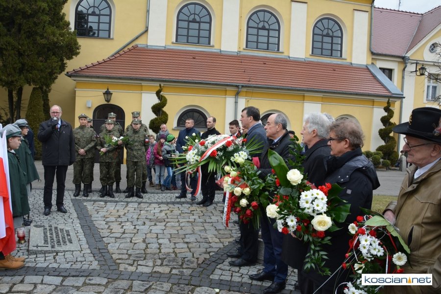Władze samorządowe powiatu, Kościana, gminy Kościan, gminy Czempiń, poseł na Sejm RP, przedstawiciele organizacji społecznych i politycznych, służb mundurowych i mieszkańcy Kościana złożyli wiązanki kwiatów pod tablicą upamiętniającą Żołnierzy Wyklętych. Wartę honorową przy tablicy zaciągnęli harcerze.