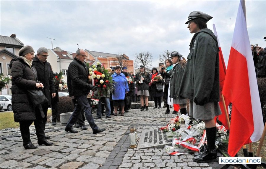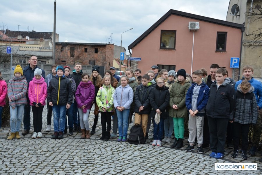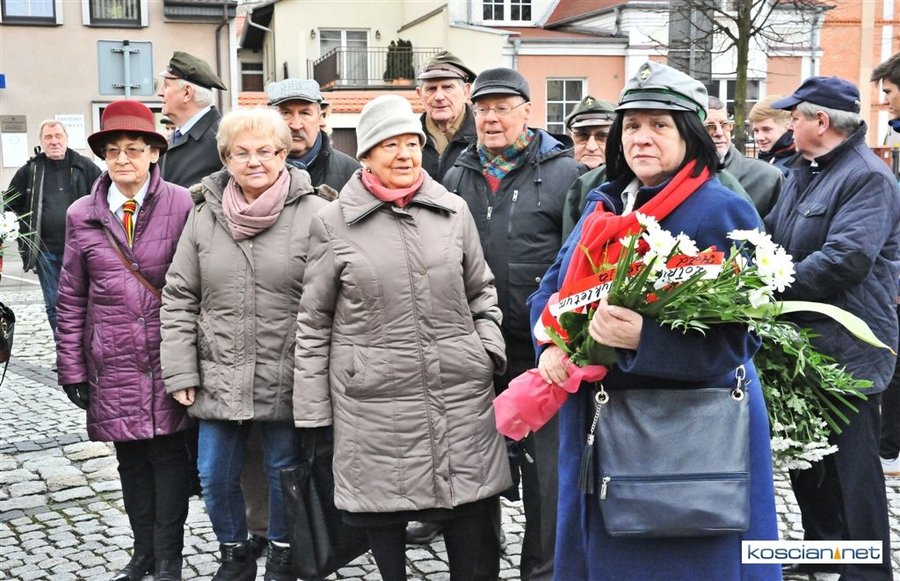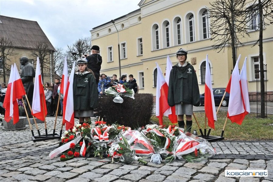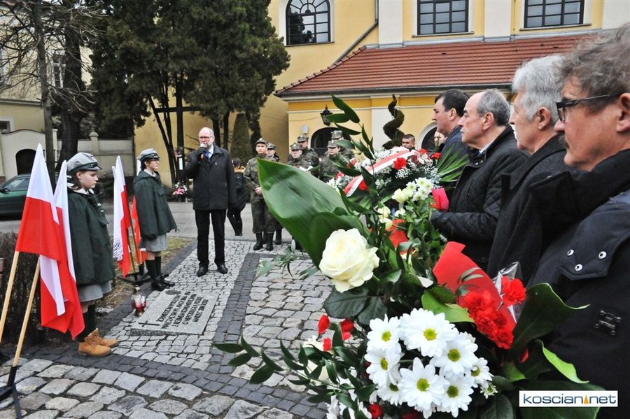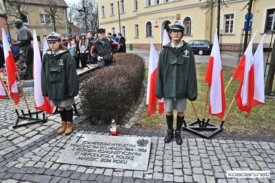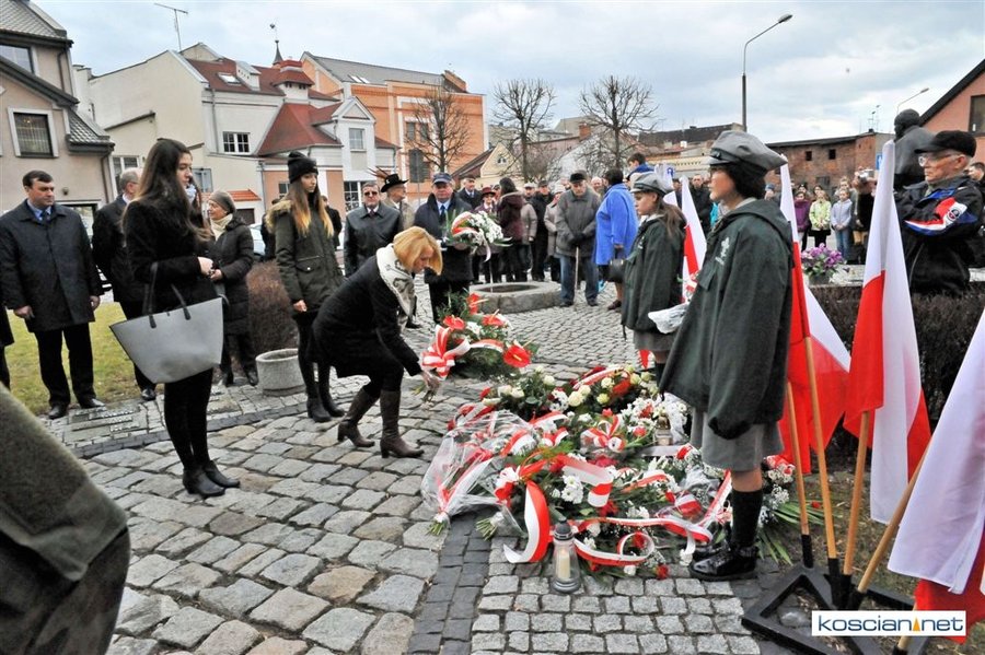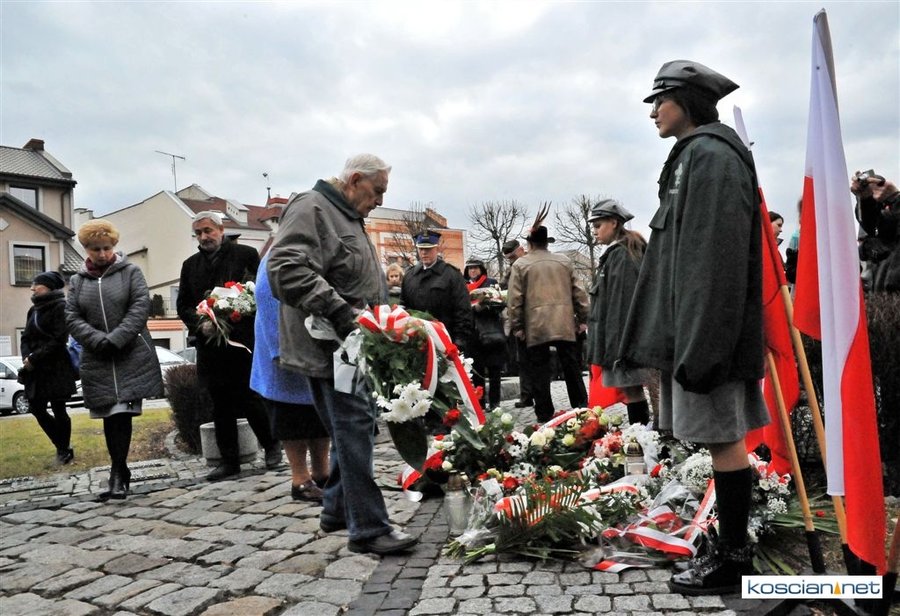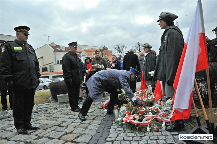 Władze samorządowe powiatu, Kościana, gminy Kościan, gminy Czempiń, poseł na Sejm RP, przedstawiciele organizacji społecznych i politycznych, służb mundurowych i mieszkańcy Kościana złożyli wiązanki kwiatów pod tablicą upamiętniającą Żołnierzy Wyklętych. Wartę honorową przy tablicy zaciągnęli harcerze.
