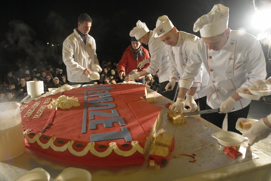 Poszczególne etapy prac można było śledzić na telebimie. Po udekorowaniu tortu i ułożeniu logo sponsora – firmy Meprozet Kościan - rozdano go wśród kościaniaków. Smakował wszystkim. Wielu chętnych skorzystało nawet z dokładki. Dzielenie i konsumpcja trwały tak długo, że z opóźnieniem w niebo poszybowały fajerwerki, a w rękach kościaniaków zapłonęły zimne ognie. (z)