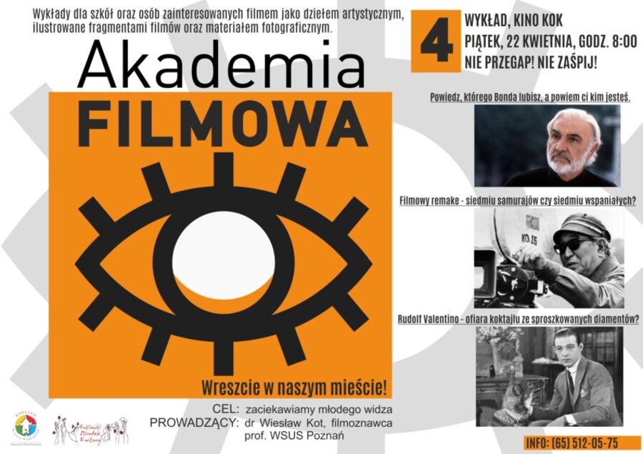 W piątek, 22 kwietnia, o godzinie ósmej rano, doktor Wiesław Kot zaprasza do Kościańskiego Ośrodka Kultury na czwarte spotkanie w Akademii Filmowej, na którym poruszy trzy tematy: Powiedz, którego Bonda lubisz, a powiem ci, kim jesteś; Rudolf Valentino - ofiara koktajlu ze sproszkowanych diamentów?; Filmowy remake - siedmiu samurajów czy siedmiu wspaniałych?