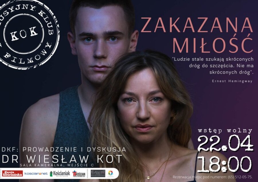 Tego samego dnia, o godzinie osiemnastej, w ramach Dyskusyjnego Klubu Filmowego Wiesława Kota zobaczyć będzie można norweski filmu „Zakazana miłość”. To thriller miłosny, który rozegra się miedzy Anitą, nauczycielką w liceum, której nie wiedzie się w życiu małżeńskim i uczuciowym, i Markusem, jej uczniem, z którym połączy ją relacja od strony społecznej niestosowna, od strony psychologicznej - toksyczna. Seans poprzedzi autorska prelekcja krytyka.