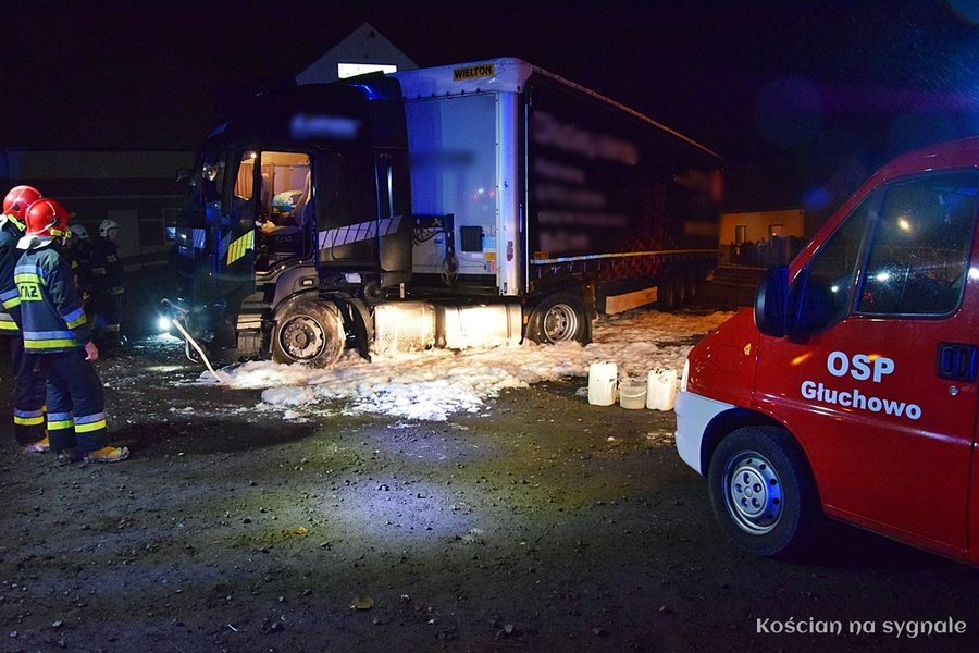 Strażacy z PSP Kościan i OSP Głuchowo usunęli z jezdni rozlane paliwo z uszkodzonego zbiornika ciężarówki.