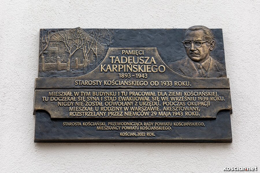 W niedzielę, 16 października, na wyremontowanej elewacji siedziby władz samorządowych powiatu i miasta Kościana odsłonięto tablicę pamiątkową poświęconą Tadeuszowi Karpińskiemu, ostatniemu w II RP Staroście Kościańskiemu. Tablicę odsłonili starosta Henryk Bartoszewski i potomkowie Tadeusza Karpińskiego. Wydarzeniu towarzyszyła wystawa fotogramów obrazujących historię budynku starostwa oraz przybliżająca postać starosty Karpińskiego.
